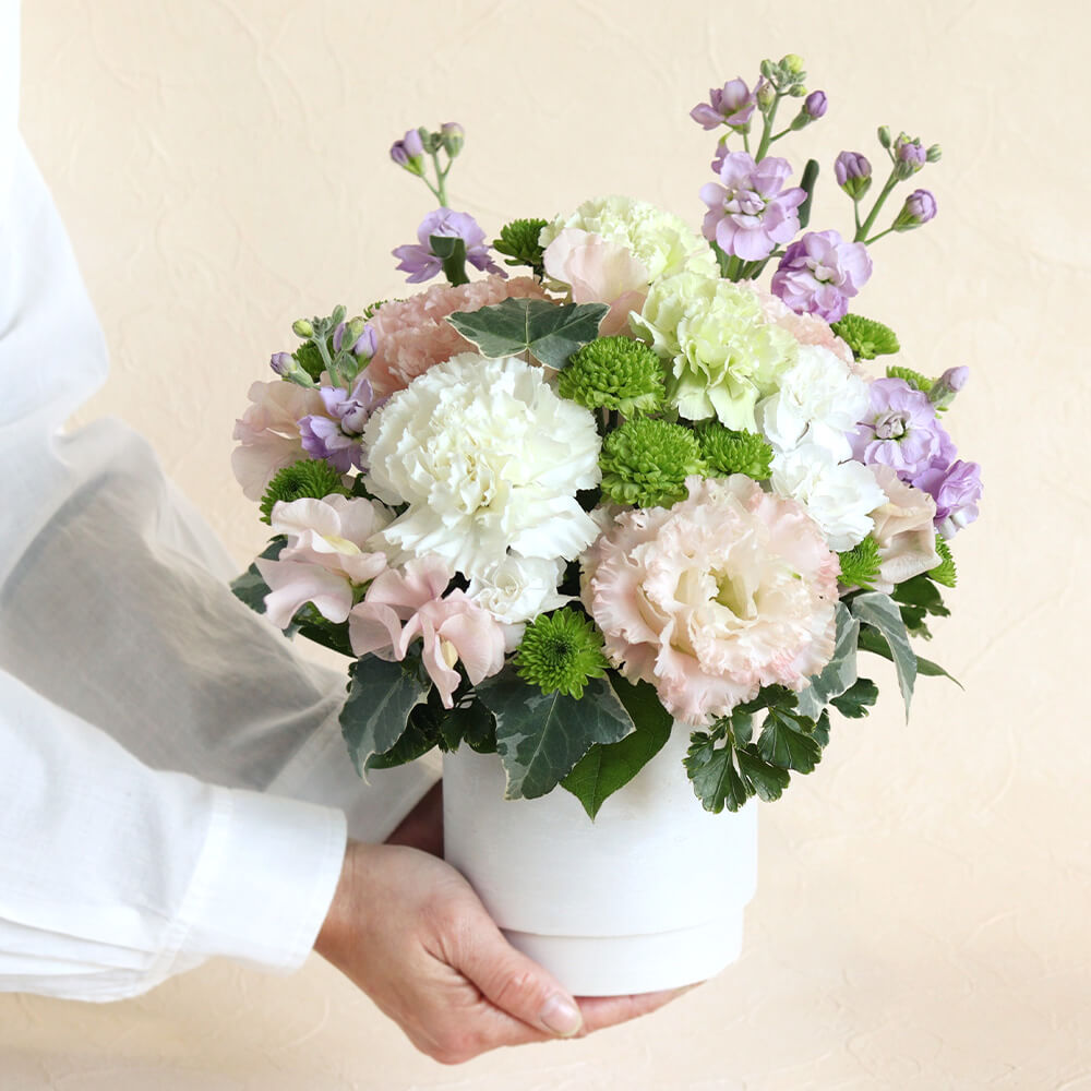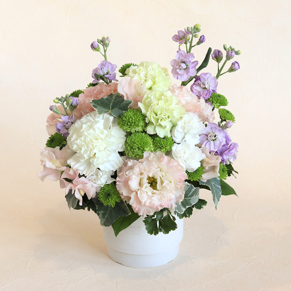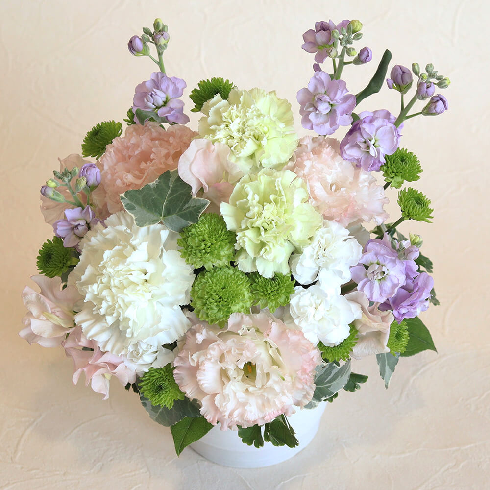 | 花材 | カーネーション2種×3輪、スプレーストック、スイートピー、トルコキキョウ、スプレーカーネーション、スプレーマム、アイビー、レモンリーフ ※花材の入荷状況により、一部内容を変更してお届けする場合があります。 |