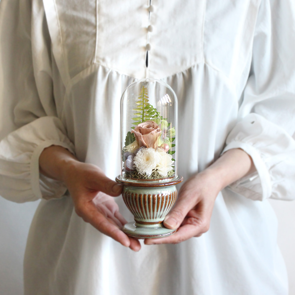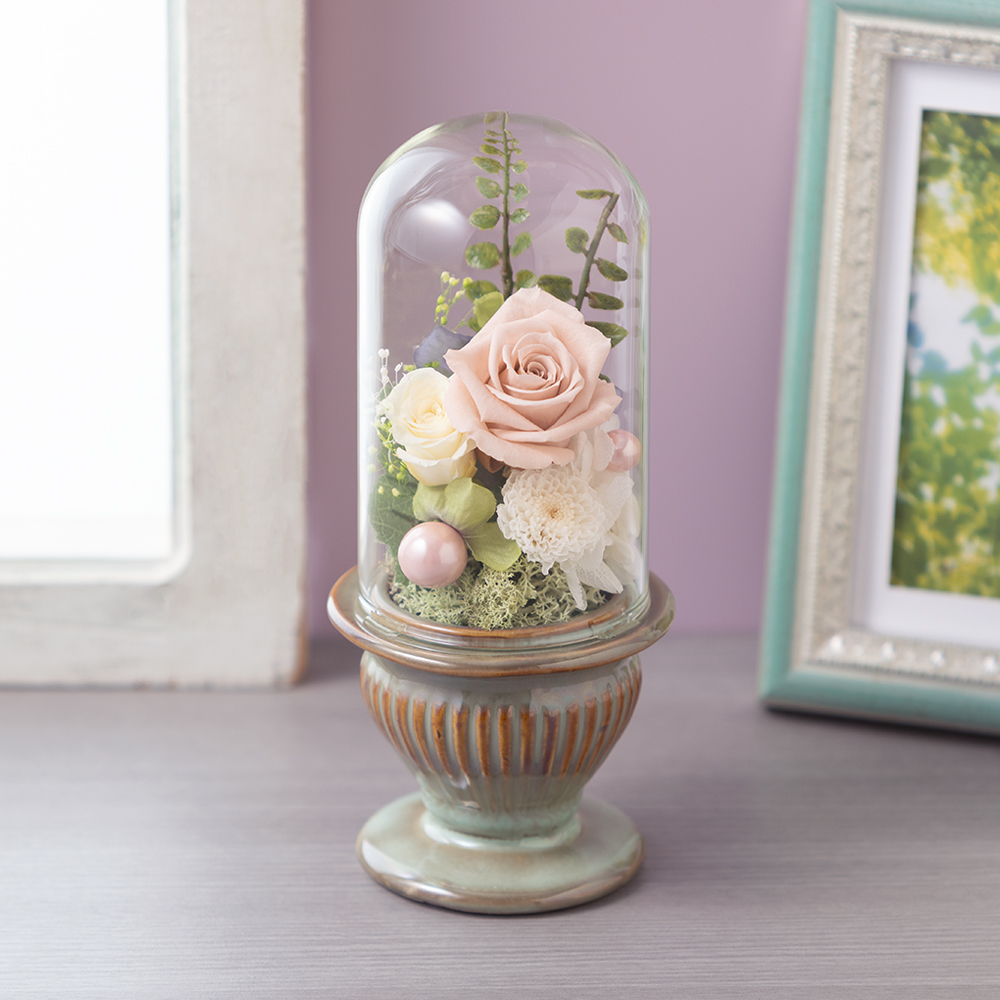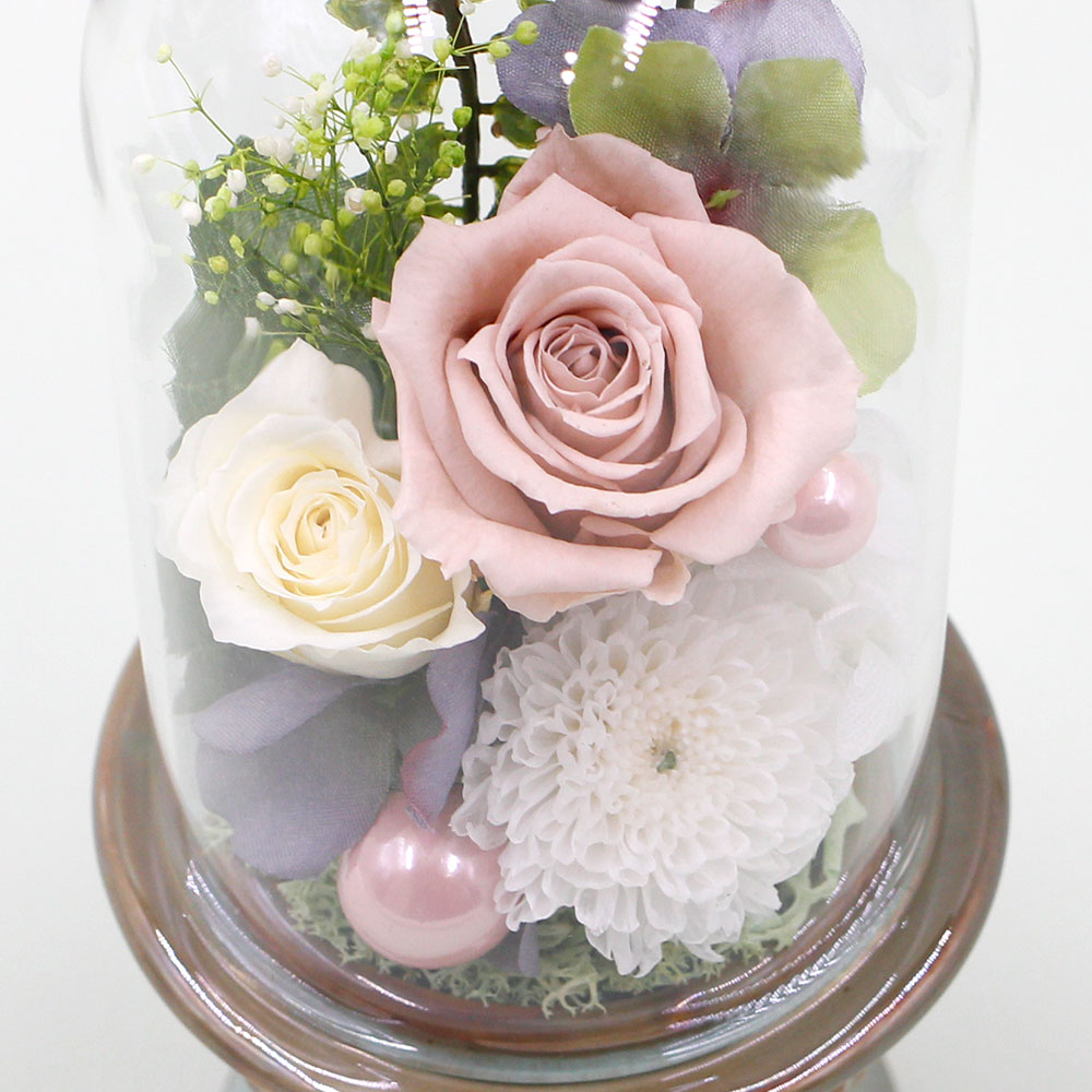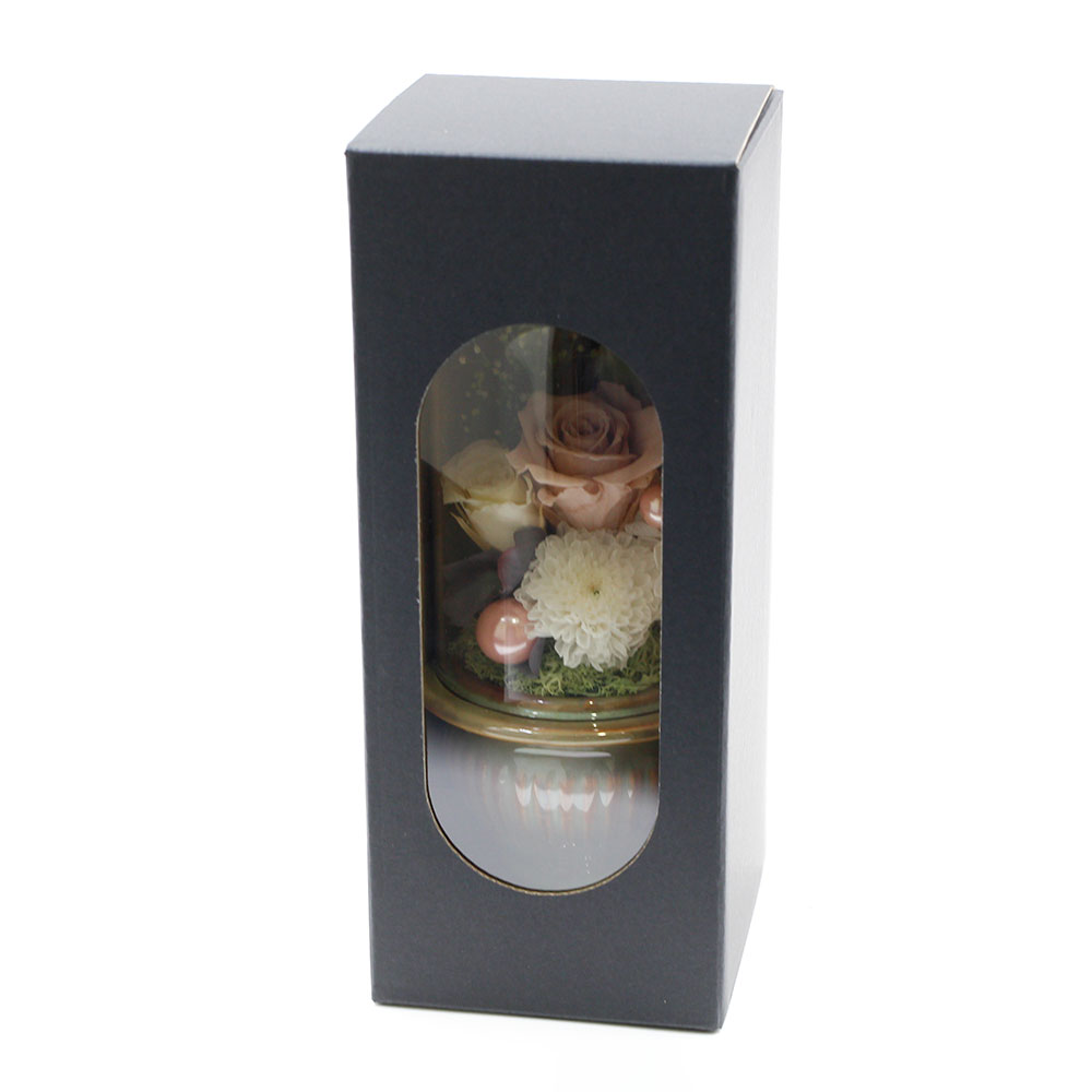 | 資材 | パールピック、ガラスドーム付き陶器製花器、専用BOX入り、お手入れ説明付き |
