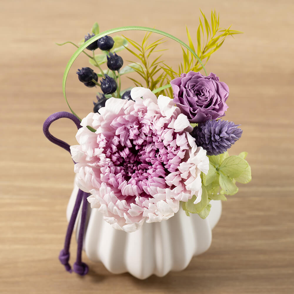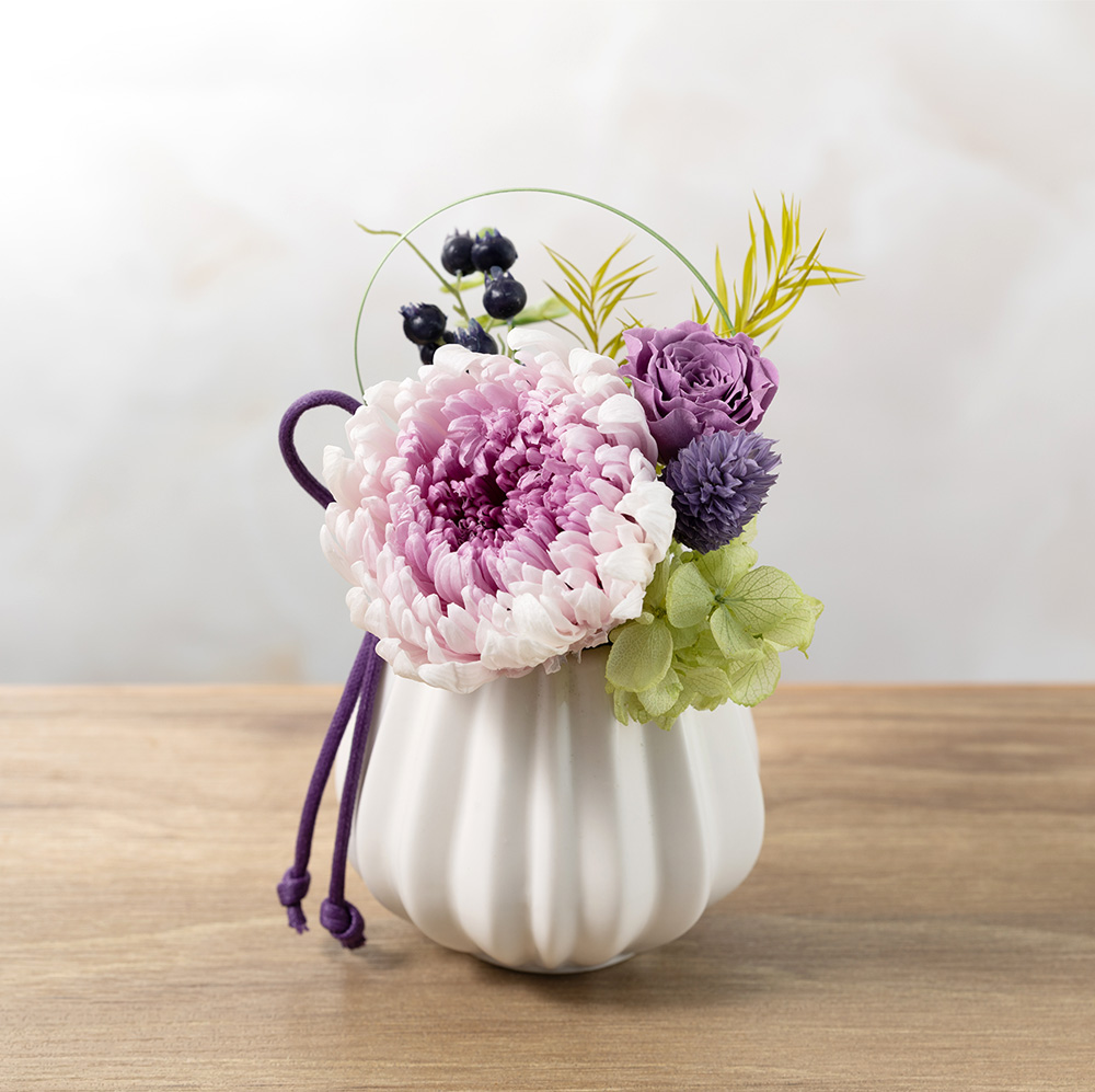 ぷっくりとした愛らしいフォルムに、縦ラインの彫りが美しい白い陶器。気品ある輪菊と可憐なミニバラに、つややかなベリーを添えて、一輪一輪の表情を大切に整えました。紫色のフェイクレザーリボンが、現代のお部屋に馴染む洗練されたアクセントに。マンション住まいや、小さな祈りのスペース(手元供養)にも無理なく飾れるコンパクトなサイズです。