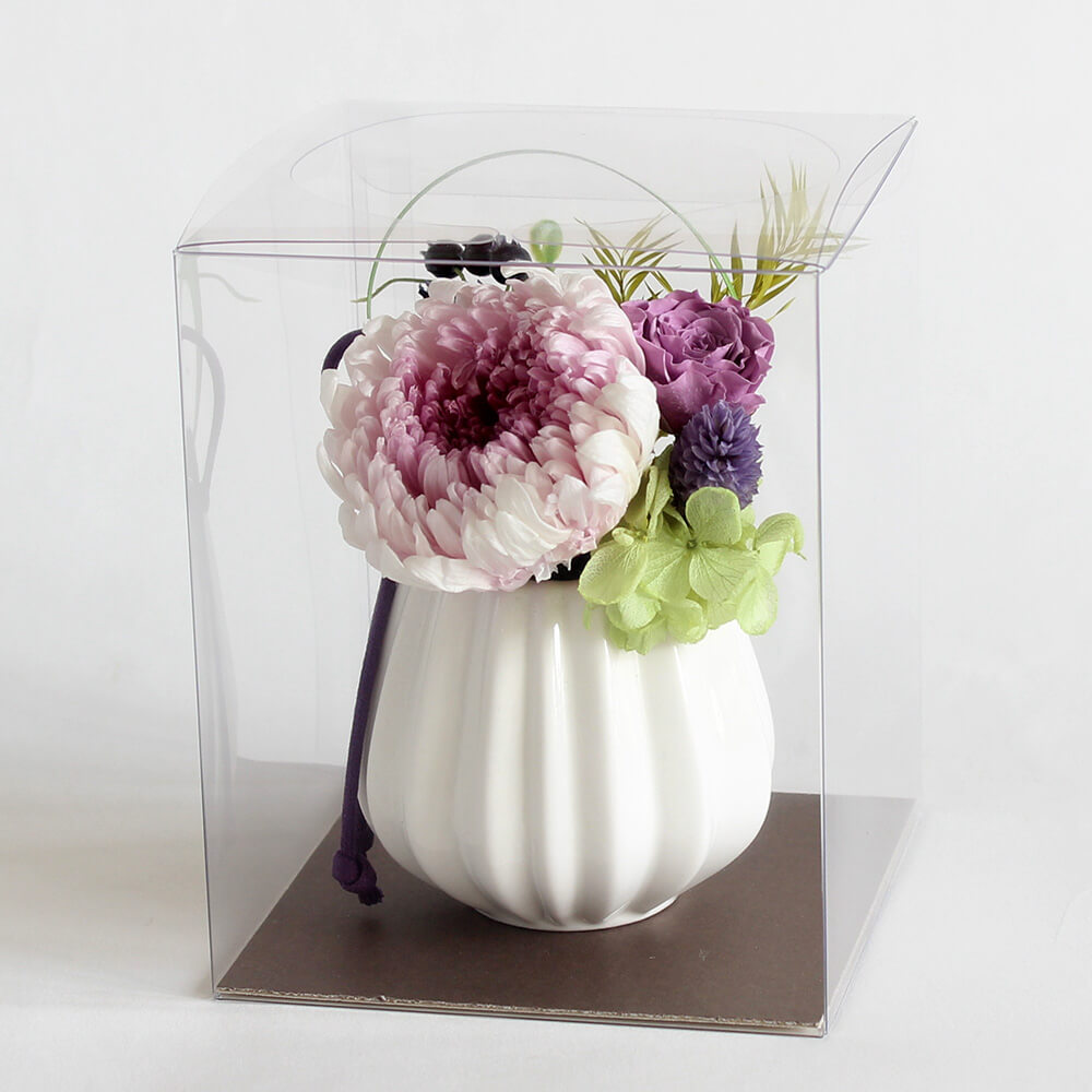| 資材 | フェイクレザーリボン、陶器製花器、クリアケース入り、お手入れ説明付き |