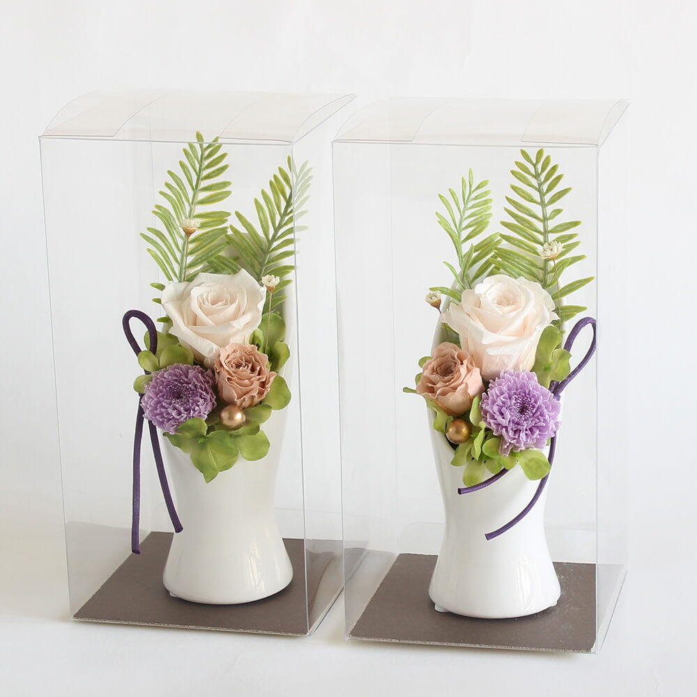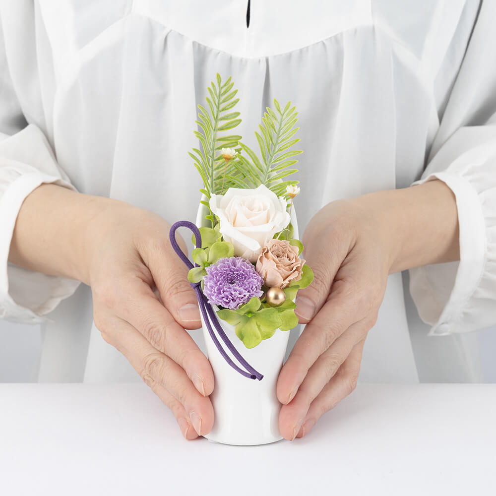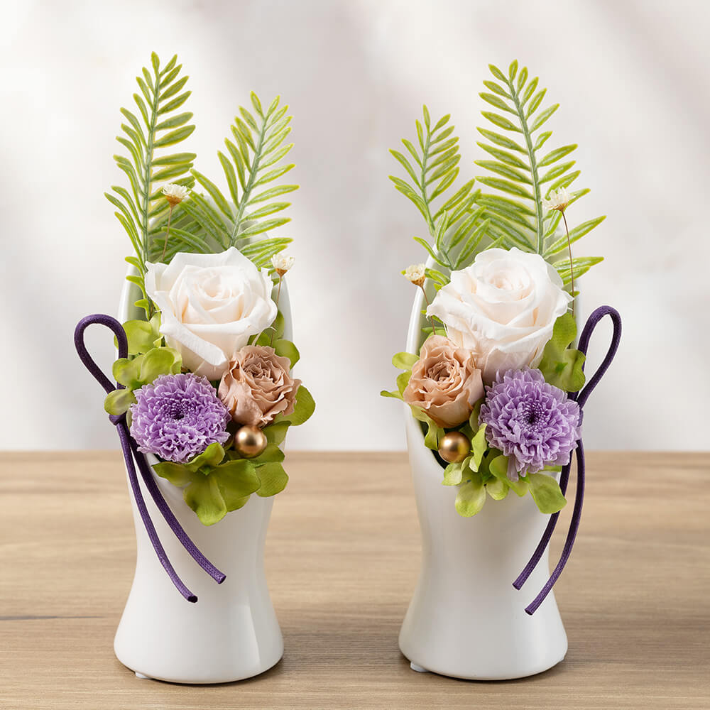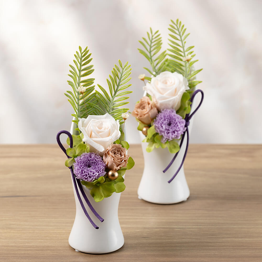 斜めにカットされた、凛とした佇まいの白い陶器。手前が少し低くなった形なので、お花がこちらをそっと見守ってくれているような、穏やかな表情を届けてくれます。ごく淡いピンクのバラやライラック色の小菊を、野に咲くような小花と合わせ、一対(左右セット)で飾ったときに最も美しく調和するようデザインしました。紫のフェイクレザーリボンが、格式の中にも温かな個性を添えています。