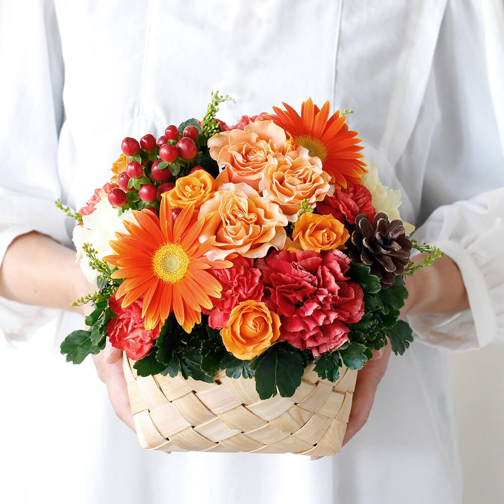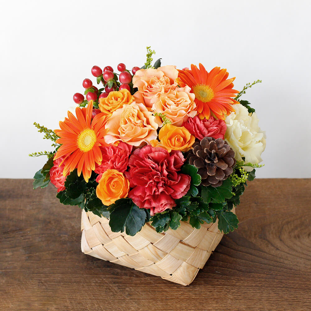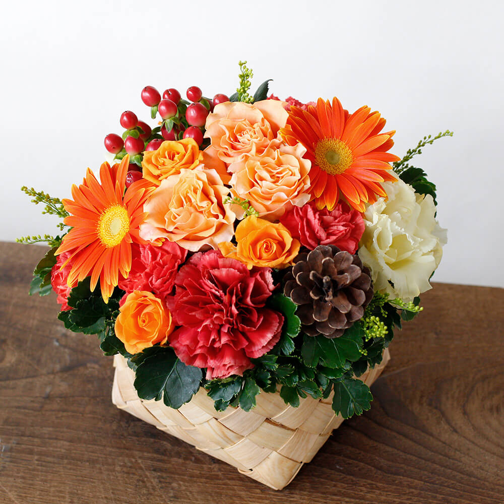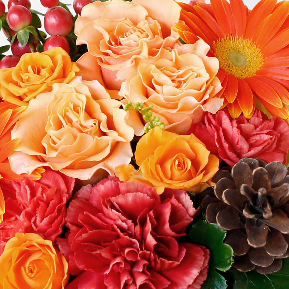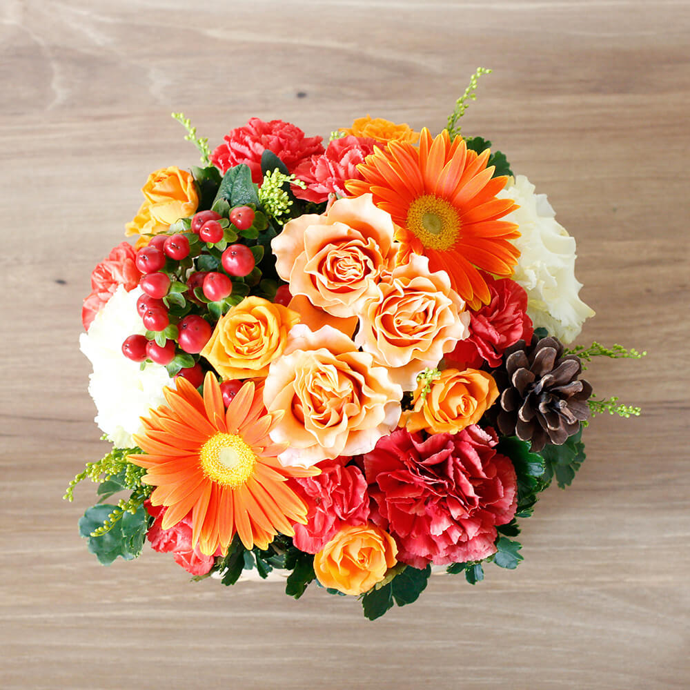 あたたかみのあるオレンジ色のバラをメインに、濃淡さまざまな花々を組み合わせた秋の気分を高めてくれるアレンジメントです。花の彩りに寄り添うように、ヒペリカムの実をあしらい季節感のあるアレンジメントに仕上げました。