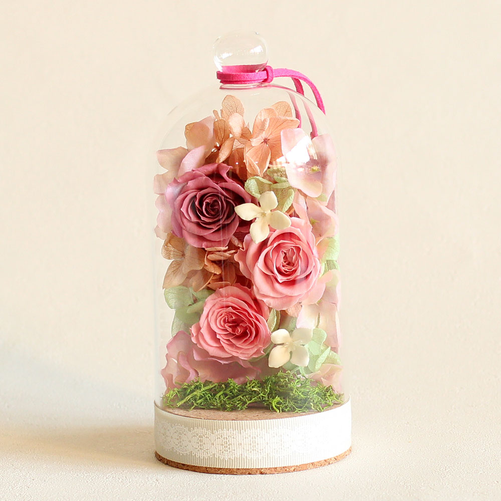 ローズとアジサイが目を惹くガラスドームアレンジ