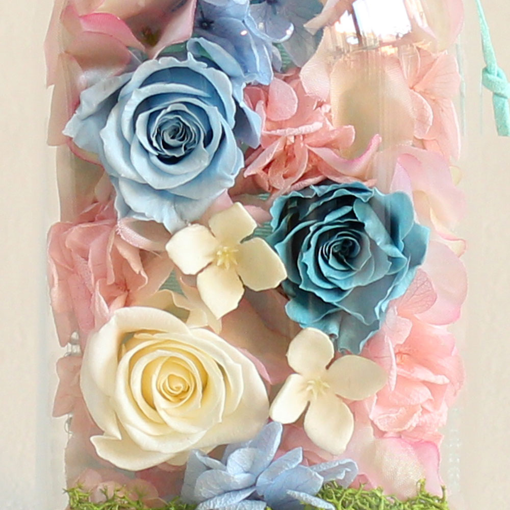 | 花材 | プリザーブドフラワー:ミニバラ、アジサイ、モス アートフラワー:小花、アジサイ |
