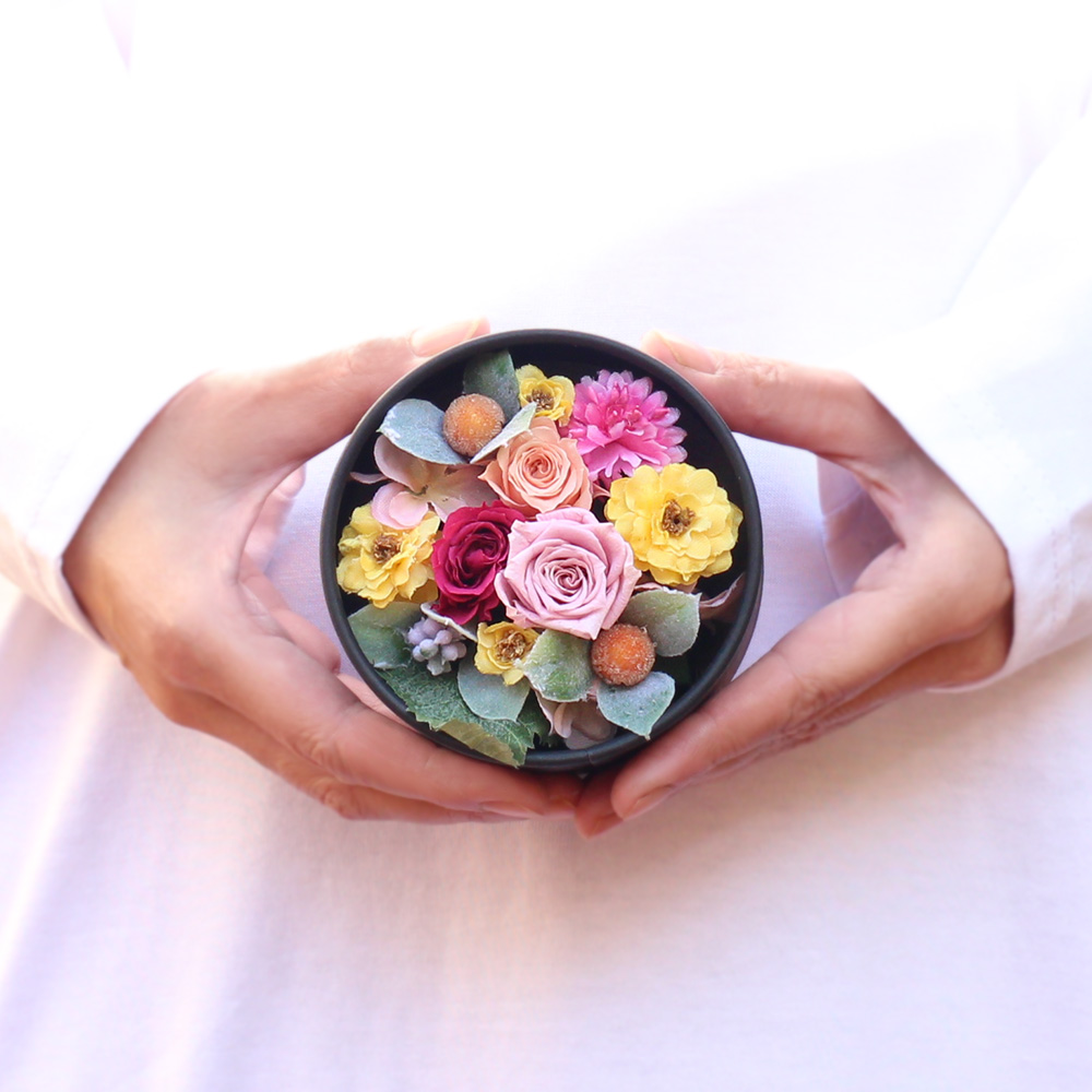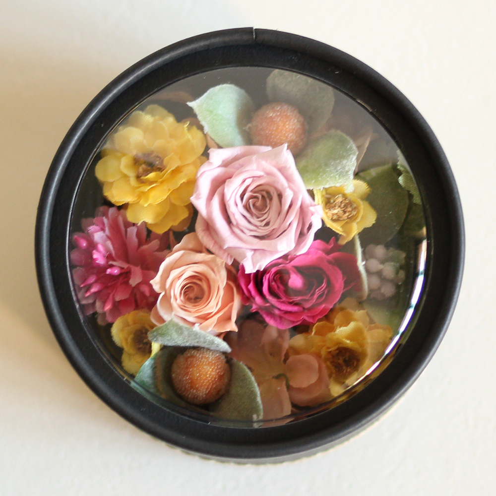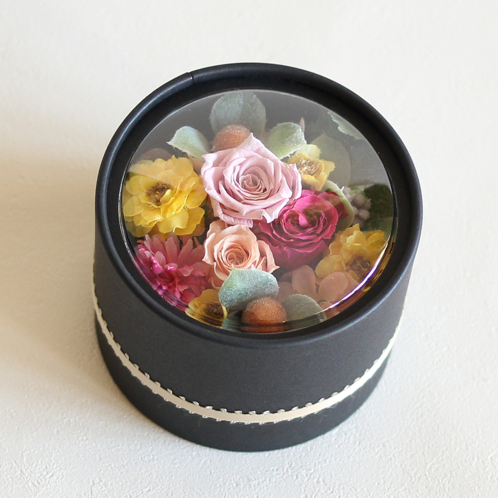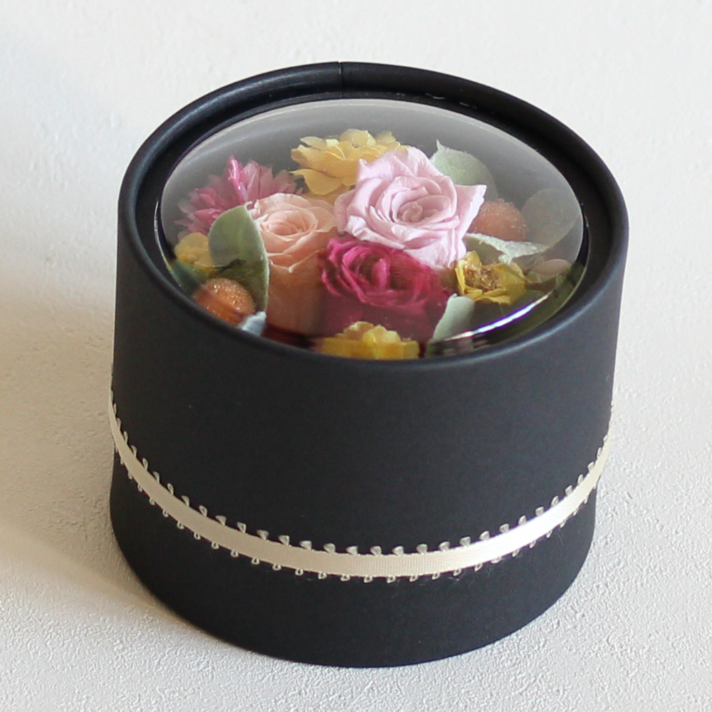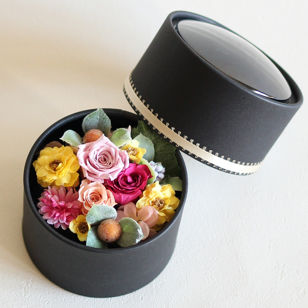 オールシーズン飾っていただけるカラフルなお花をセレクト。シックなブラックのドームBOXでまとめていますのでおうち中、場所を選ばず飾っていただけます。