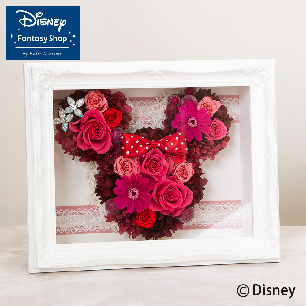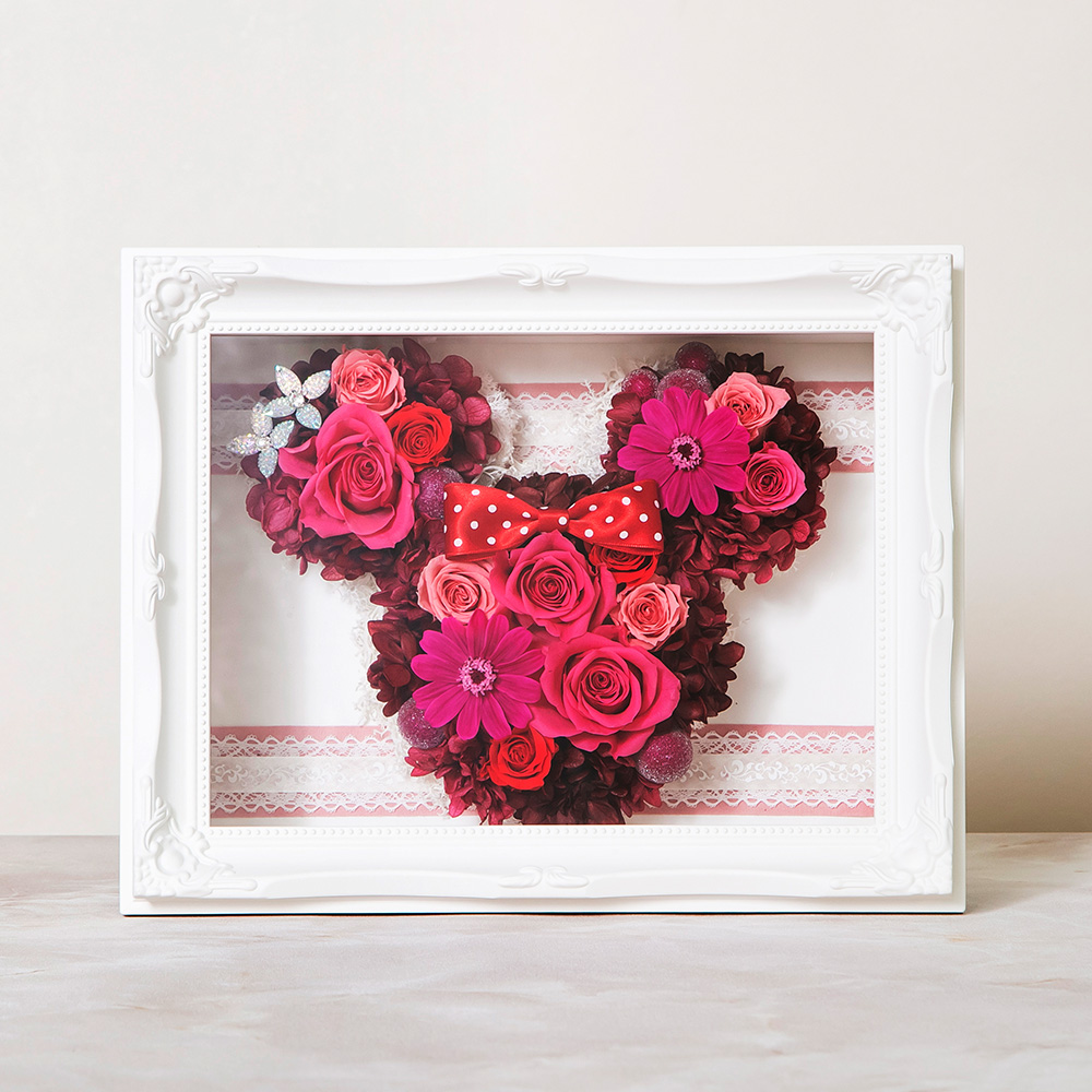 ピンクから赤のグラデーションのバラやダリア、アジサイで豪華なミニーシルエットのプリザーブドフラワーのフレームアレンジ。真っ白なヨーロピアン調のフレームがエレガントな花色をより際立たせ、高級感をかもし出します。フレームと壁掛けの2WAYタイプなので、飾る場所に合わせて、お楽しみください。