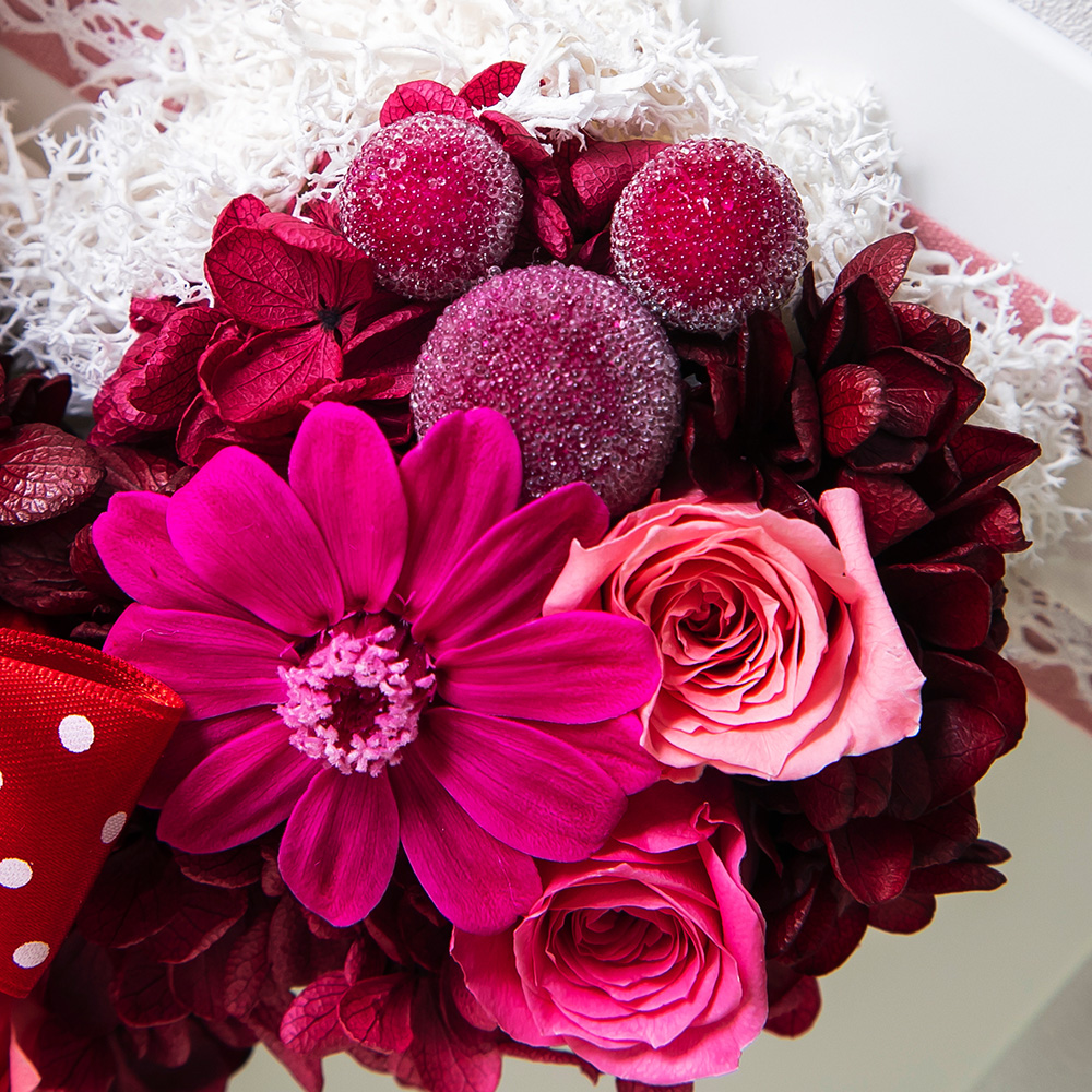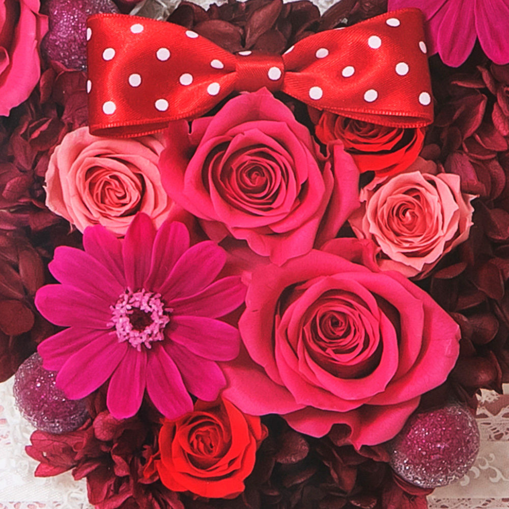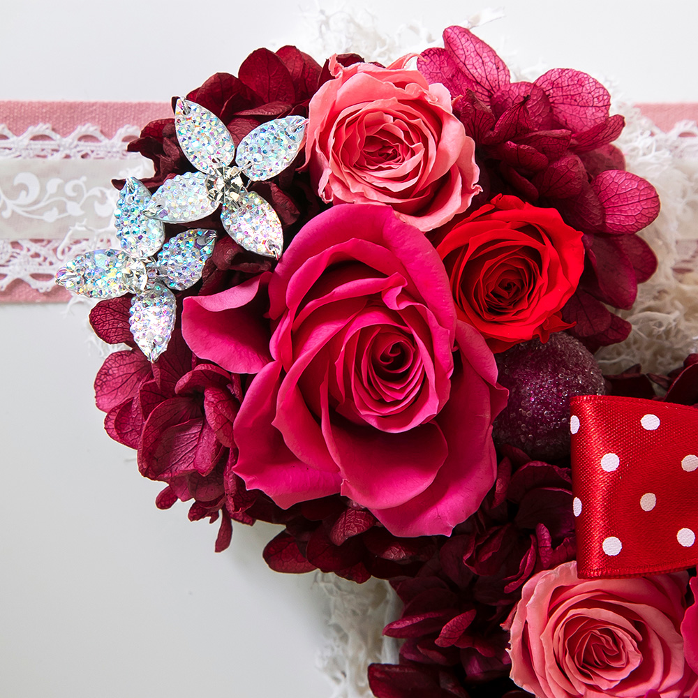 花材 | プリザーブドフラワー:バラ、ミニバラ、ジニア、アジサイ、モス |