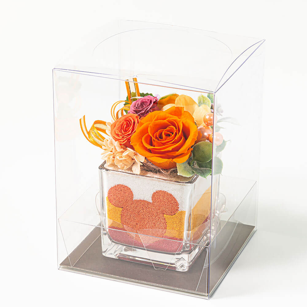 さりげないキャラクター使いがお洒落なプリザーブドアレンジには、受け取った方を笑顔にさせる特別な魔法が!まず目に飛び込んでくるのは、ガラスの器にカラーサンドで作ったミッキーマウスのシルエット。そして大きなバラの後ろには、ミッキーモチーフの上品なパールピックが花の間からチラ見えします。見つけただけでなんだか幸せな気分になれそうですね。
