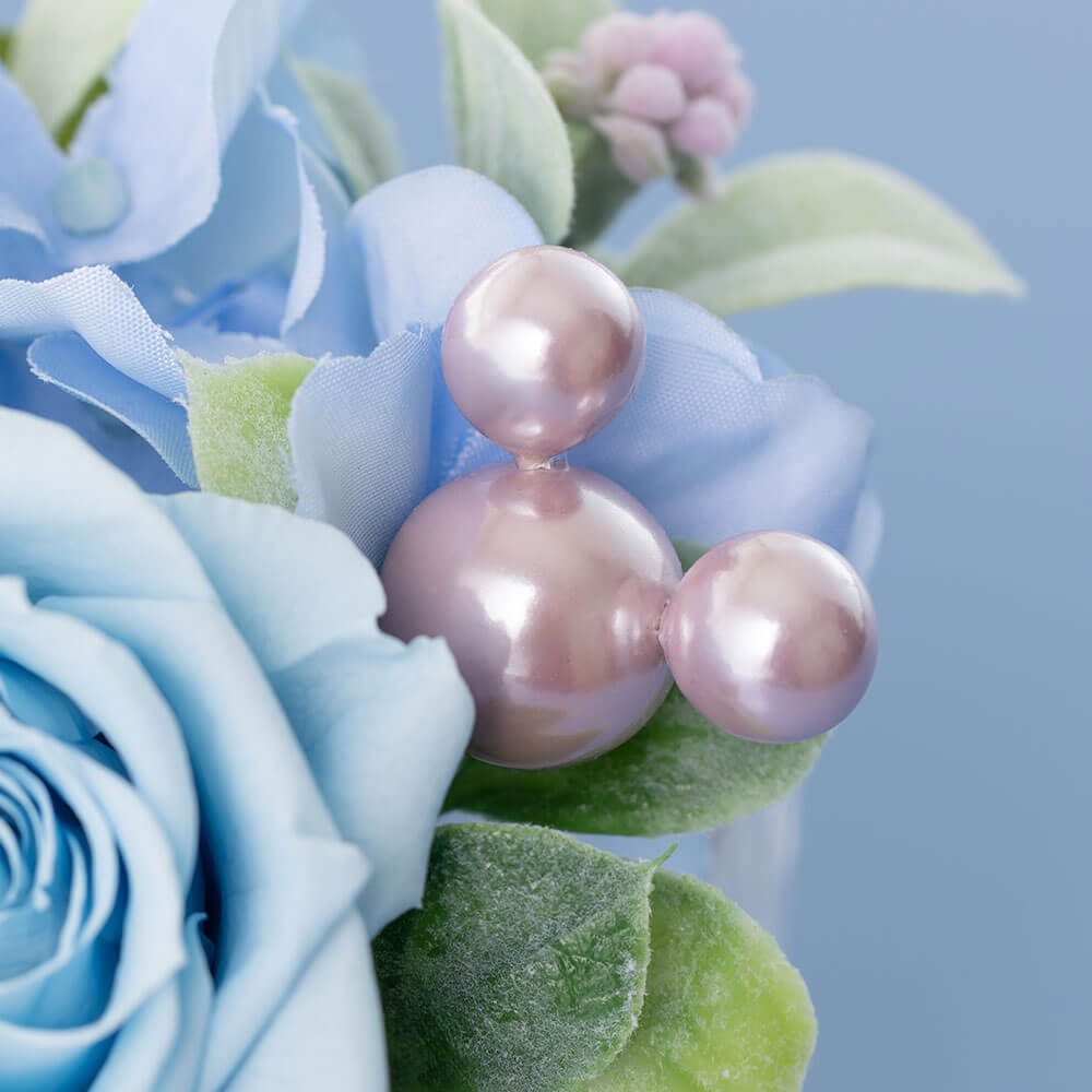 さりげないキャラクター使いがお洒落なプリザーブドアレンジには、受け取った方を笑顔にさせる特別な魔法が!まず目に飛び込んでくるのは、ガラスの器にカラーサンドで作ったミッキーマウスのシルエット。そして大きなバラの後ろには、ミッキーモチーフの上品なパールピックが花の間からチラ見えします。見つけただけでなんだか幸せな気分になれそうですね。