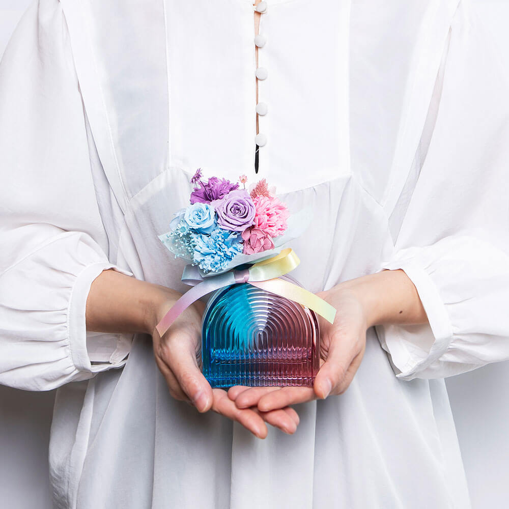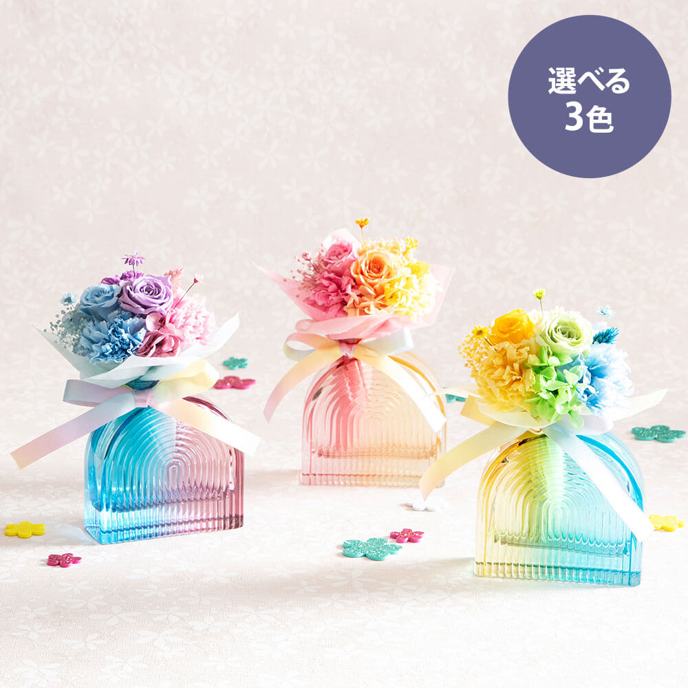 虹の橋のたもとで待つあの子をイメージして選べる、彩り豊かなブーケ風アレンジ。美しいグラデーションの器が、大切な場所を明るく清らかに彩ります。3種類並べると虹の色彩が繋がる、遊び心と優しさが詰まったデザイン。器のくびれ部分にパステルレインボーのリボンを結んでお届けします。
