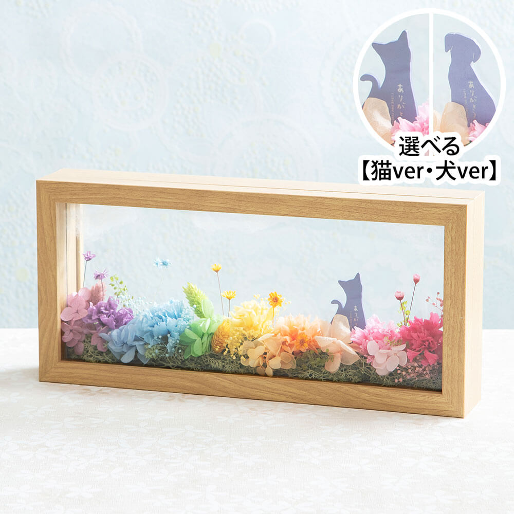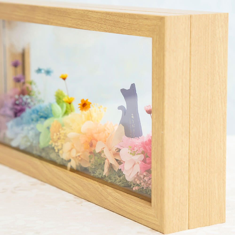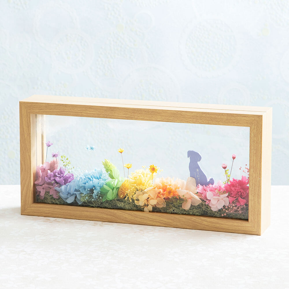 虹の橋のたもとで、いつか再会できる日を待つあの子。フレームの上部に浮かぶのは、ふわふわの雲。その下には、あの子が自由に駆け回る虹色の花園が広がります。前後のガラスが光を通し、思い出をどこまでも明るく包み込む風景は、ご主人の心を優しく癒してくれることでしょう。