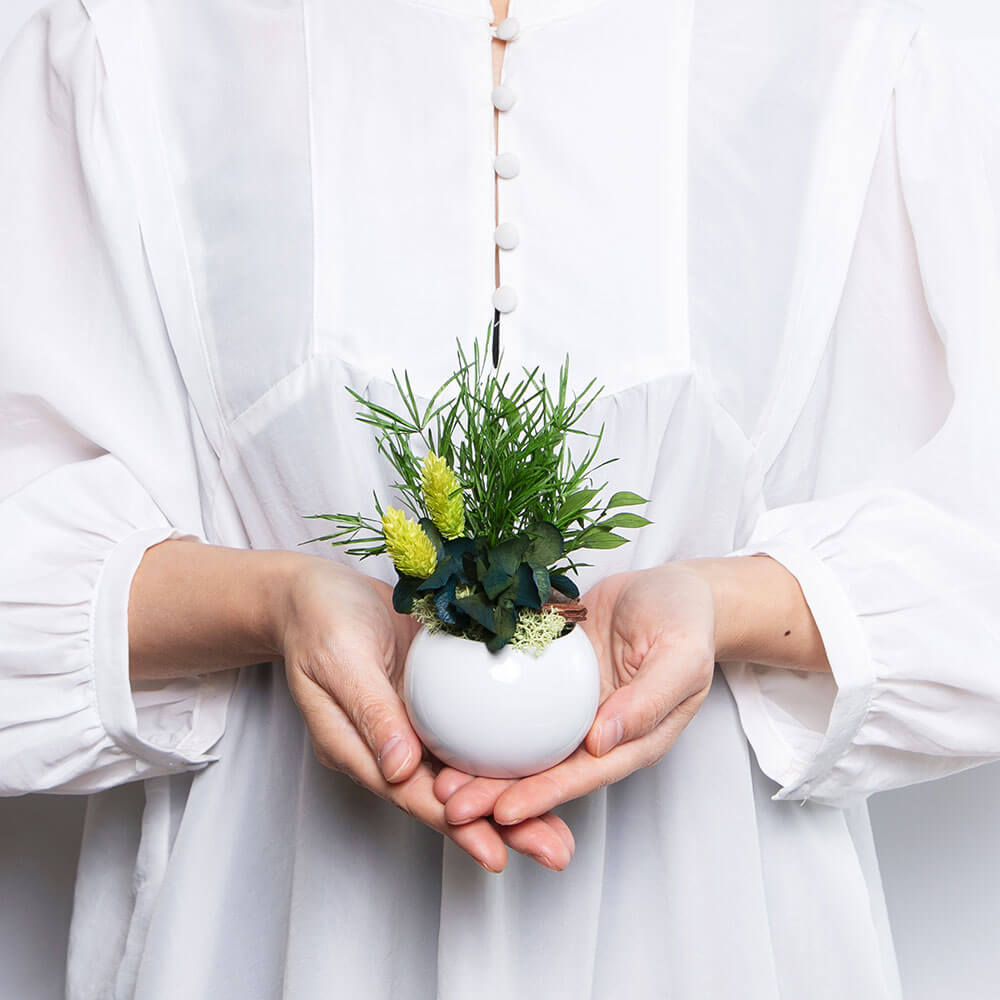 ひとつひとつの器に広がるのは、自然界のルールを超えたグリーンの風景。本来なら一緒に育つことのない植物たちを、プリザーブドならではの瑞々しい質感で贅沢に組み合わせました。リビングの飾り棚や寝室のベッドサイド、一人暮らしのお部屋など、ちょっとしたスペースに飾れるコンパクトなサイズ感です。