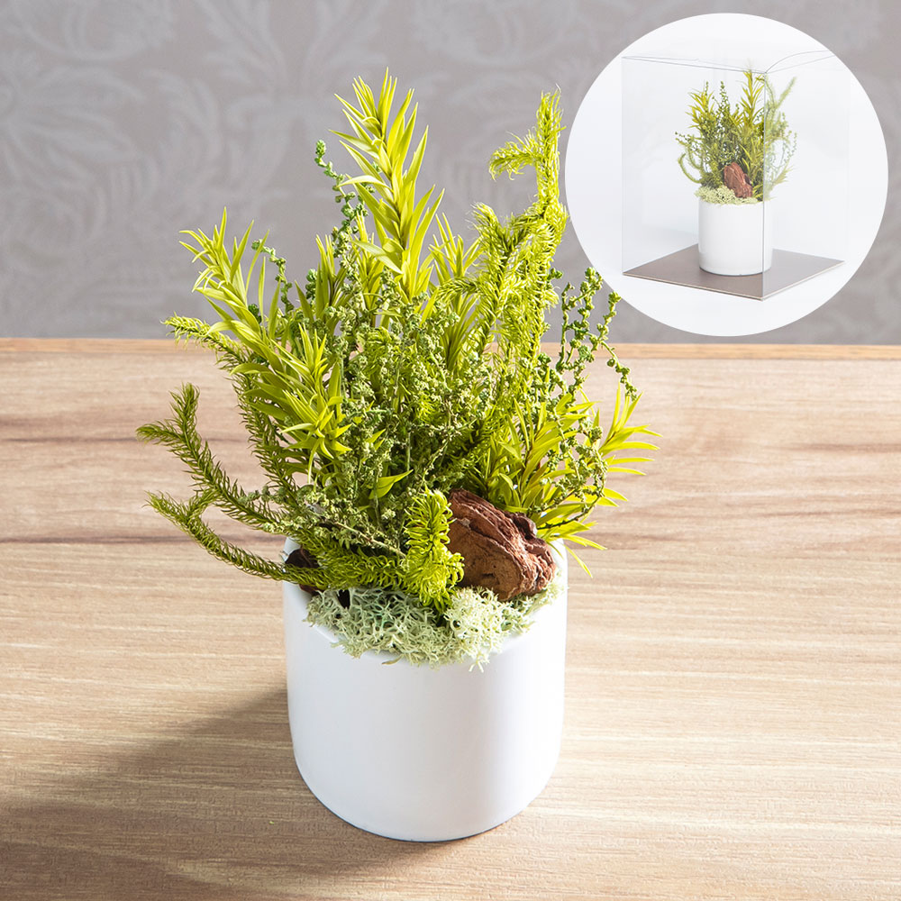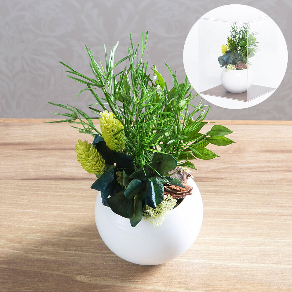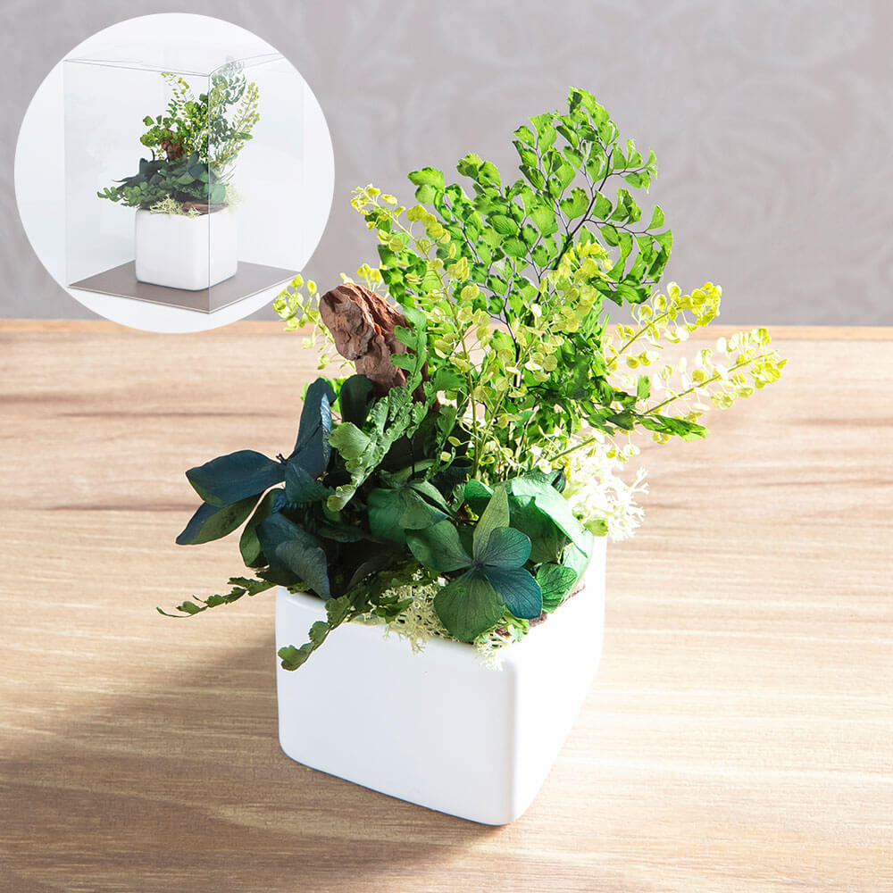 ホコリを気にせず飾れるクリアケースに入れてお届け。水やり不要で、忙しい毎日にそっと寄り添います。
