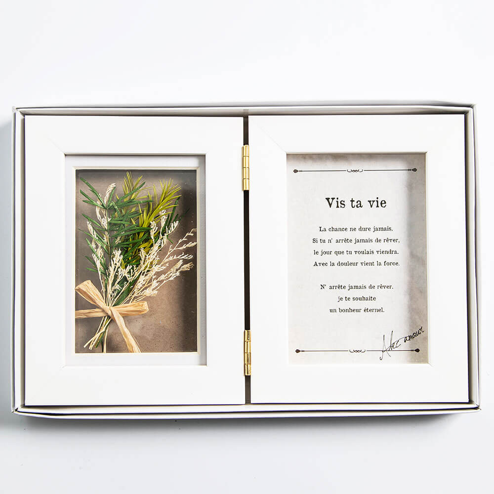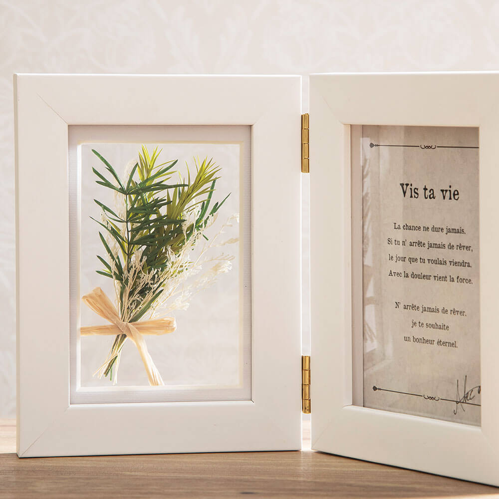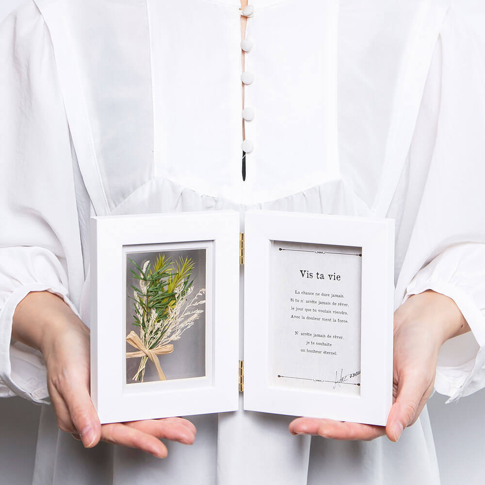 お気に入りの写真の隣で、爽やかなグリーンブーケが光に透けて美しく輝きます。透明感のある仕立てが、空間に軽やかな彩りをプラス。大切な思い出を、柔らかな光と共に飾れます。コンパクトな自立タイプのフォトフレームですので、ちょっとしたスペースに飾ってお楽しみいただけます。