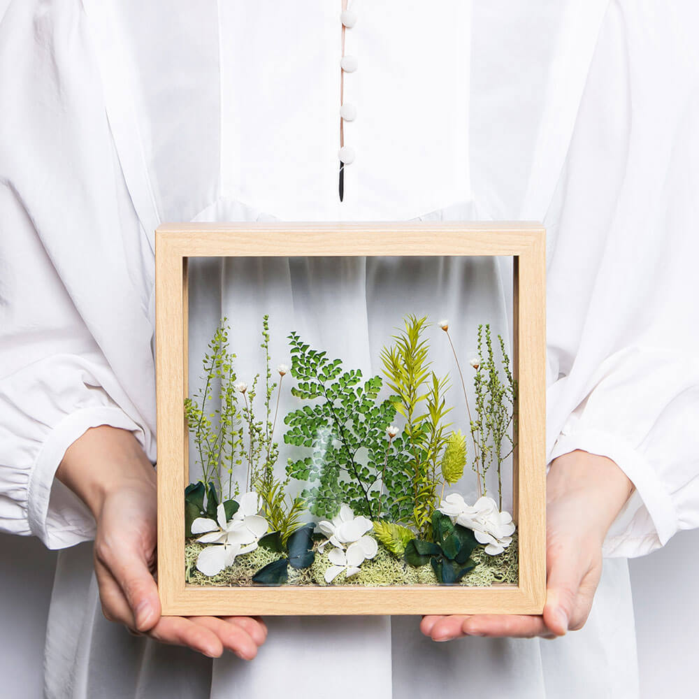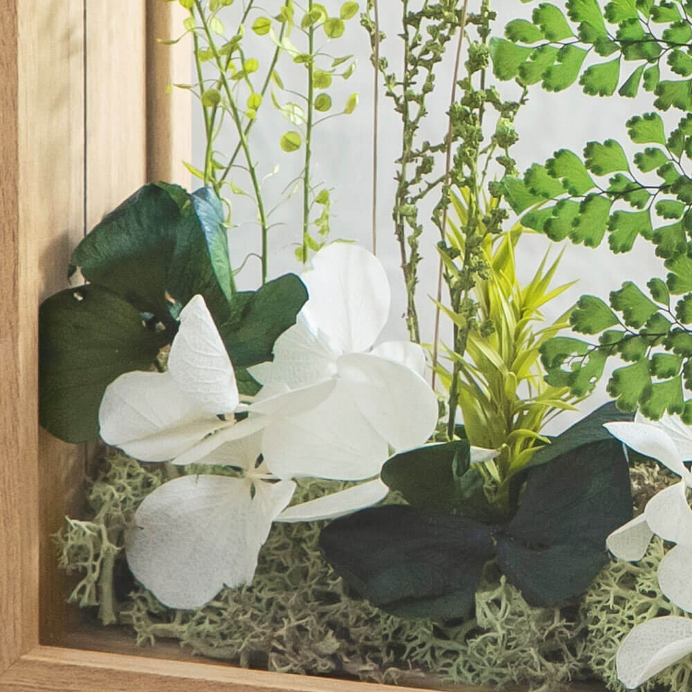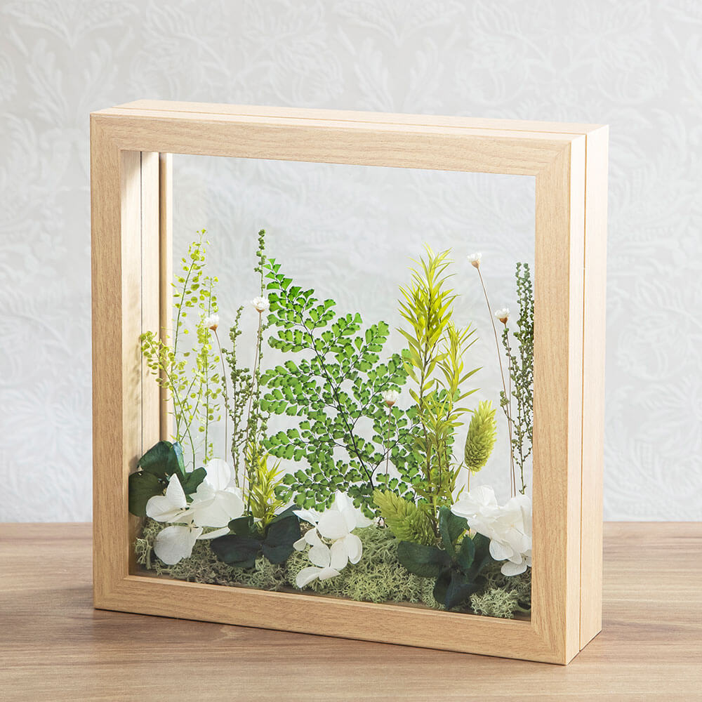 前後のガラスが光を通し、まるで森の木漏れ日を切り取ったようなフレームアレンジ。思わず深呼吸をしたくなるような癒しの時間を過ごせそうです。グリーンやアジサイ、小花たちが光の中に溶け込むような佇まいは、暮らしに穏やかなリズムを運んでくれることでしょう。