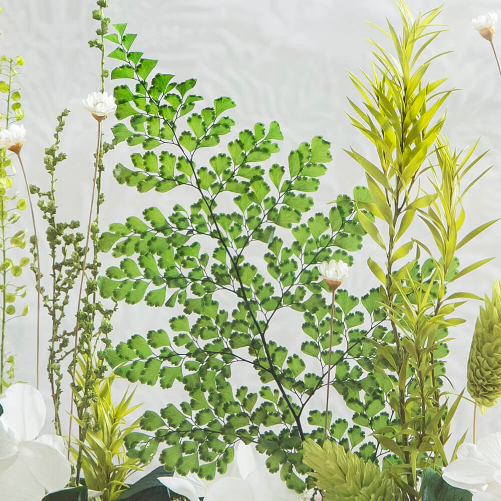 | 花材 | プリザーブドフラワー:グリーン(アジアンタム、ストーベ、ティーツリー、ペティーコート)、アジサイ、モス ドライフラワー:ファラリス、グリクシア |