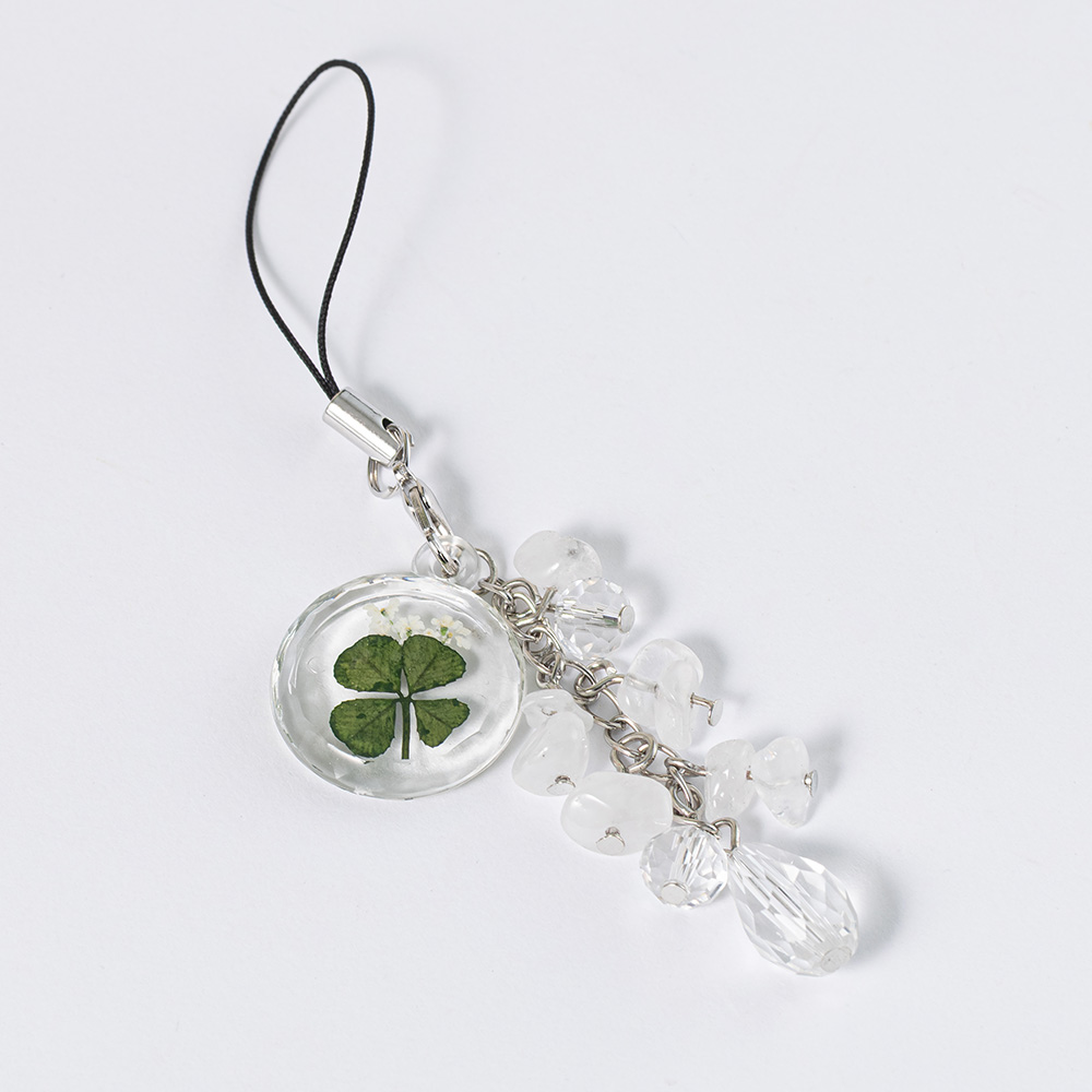 リボン部分には、本物の水晶をあしらったストラップ仕様のチャームを添えています。