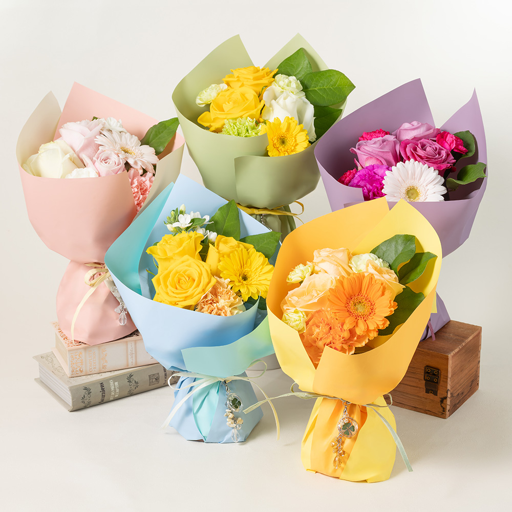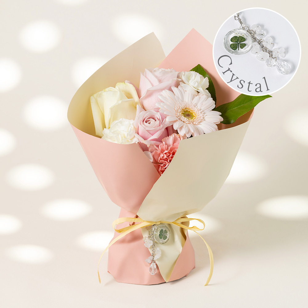 4月の誕生石「水晶」をイメージした花々を集めた、そのまま飾れるブーケです。華やかなバラをメインにカーネーション、ガーベラなどの花々を合わせました。
