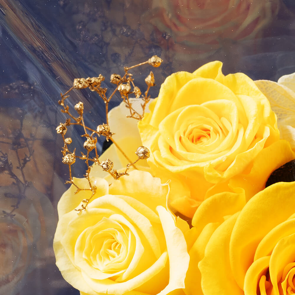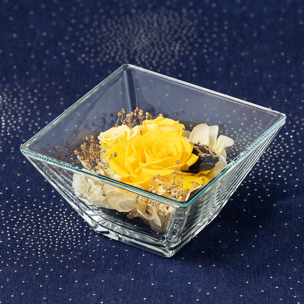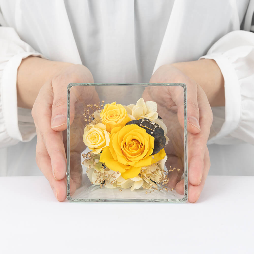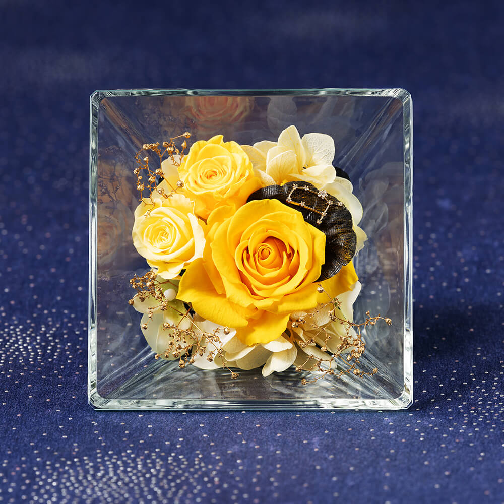 バラの隣で静かに瞬くのは、夜空を模した花弁にあしらわれた双子座のチャーム。手前に向かって広がるガラスに入ったデザインは、置いたときにお花と目が合いやすく、まるで小さな窓から星空をのぞき込んでいるかのようです。蓋付きなので、お手入れはホコリが付いたら表面をサッとふき取るだけ。きれいな瞬間を永く保てるので、上質なインテリアとして場所を選ばず飾っていただけます。