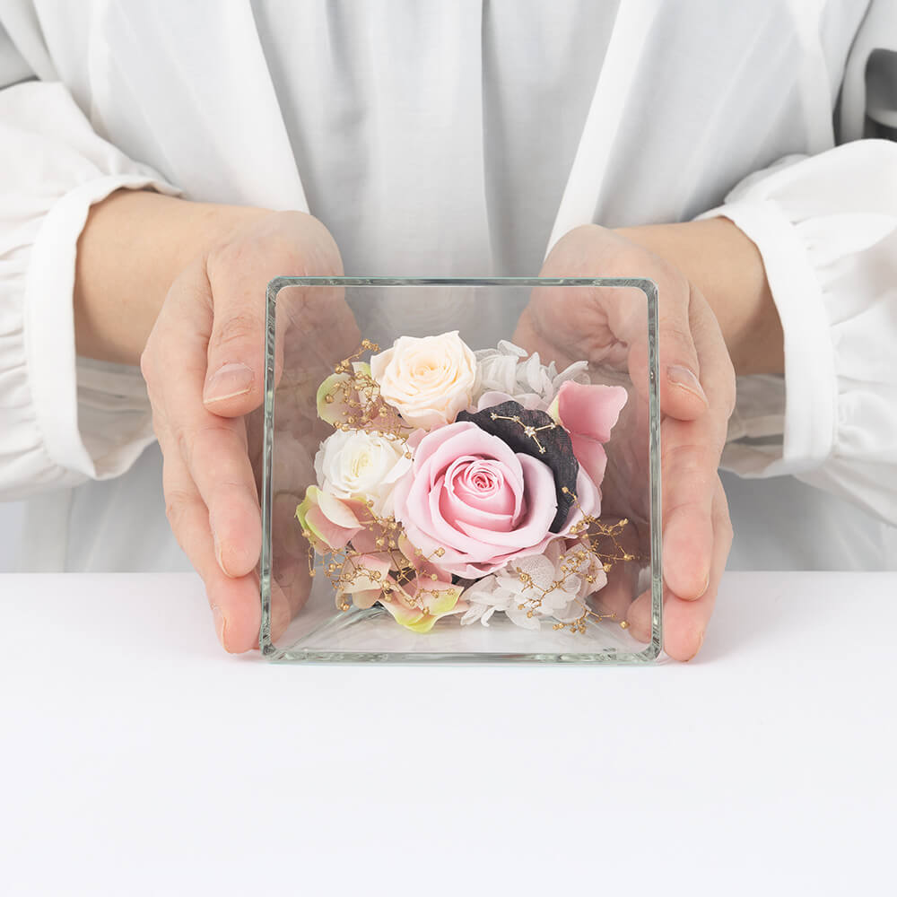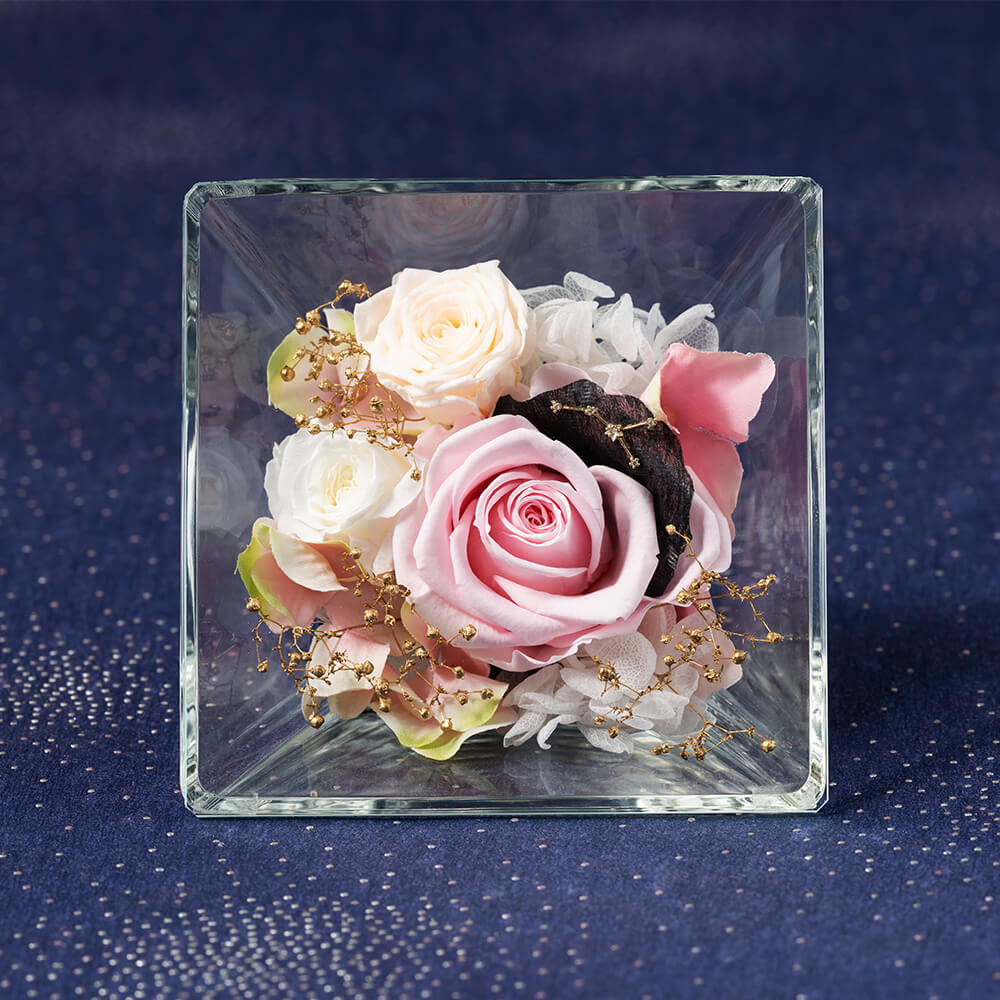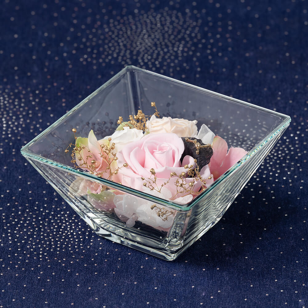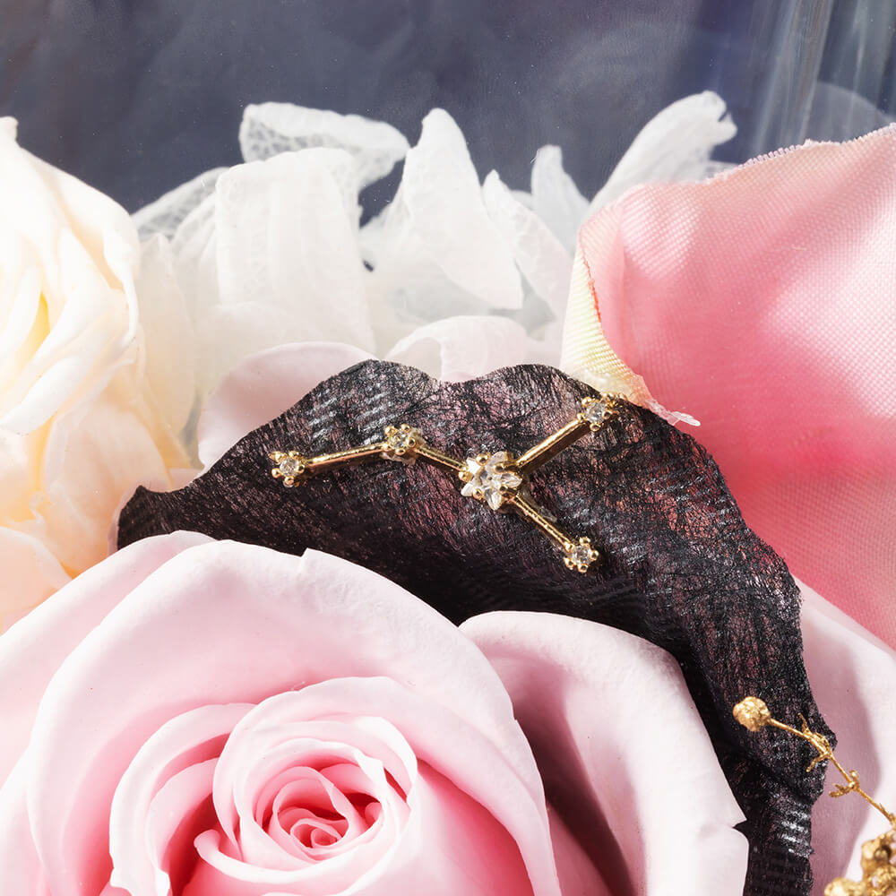 バラの隣で静かに瞬くのは、夜空を模した花弁にあしらわれた蟹座のチャーム。手前に向かって広がるガラスに入ったデザインは、置いたときにお花と目が合いやすく、まるで小さな窓から星空をのぞき込んでいるかのようです。蓋付きなので、お手入れはホコリが付いたら表面をサッとふき取るだけ。きれいな瞬間を永く保てるので、上質なインテリアとして場所を選ばず飾っていただけます。