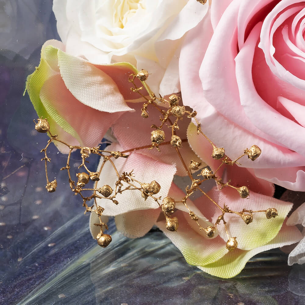 | 花材 | プリザーブドフラワー:バラ、ミニバラ、カスミソウ、アジサイ アートフラワー:ローズペタル(漆黒のバラの花弁)、アジサイ |