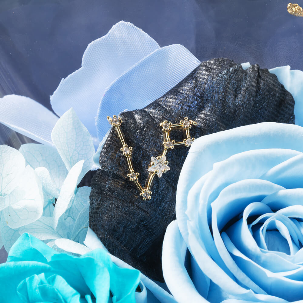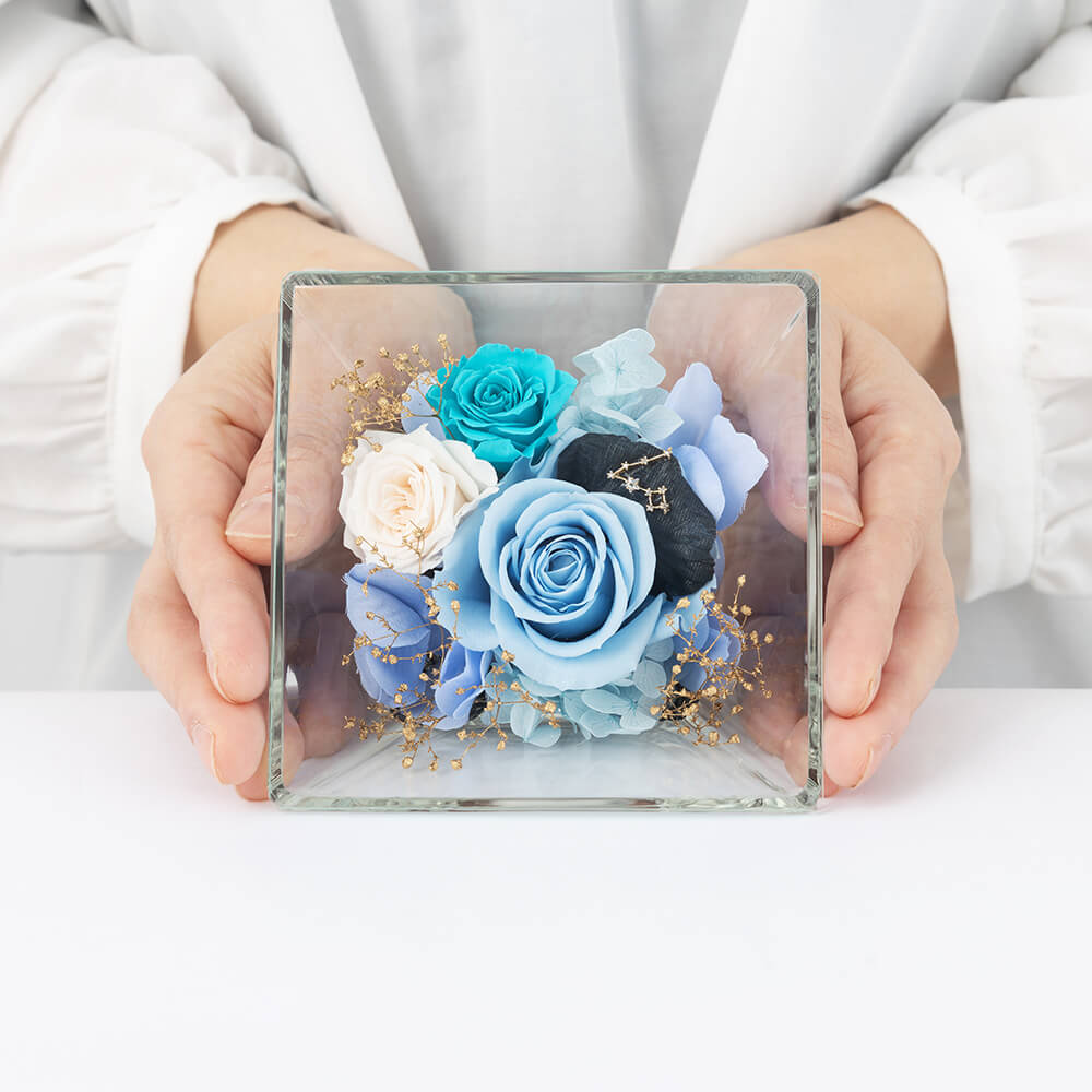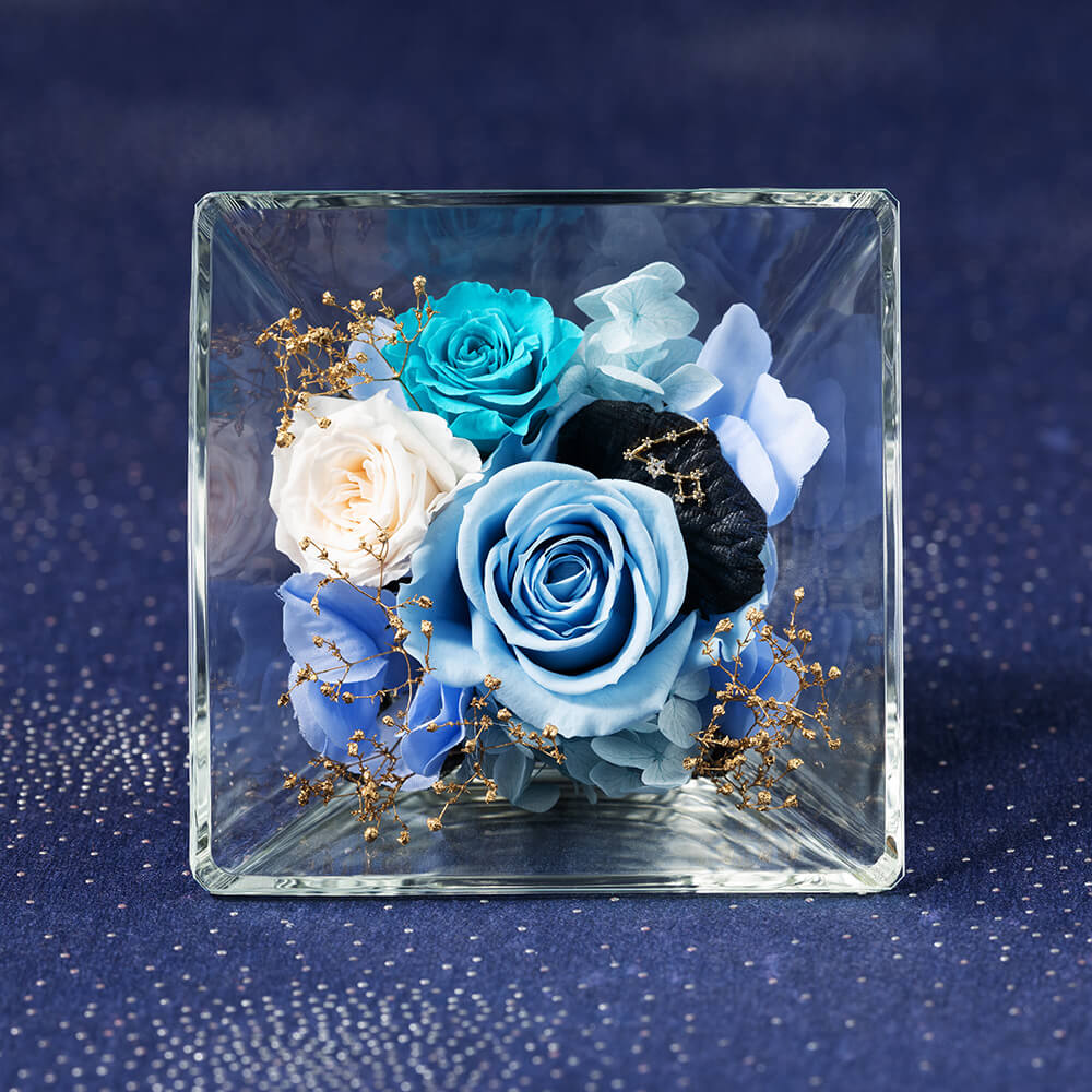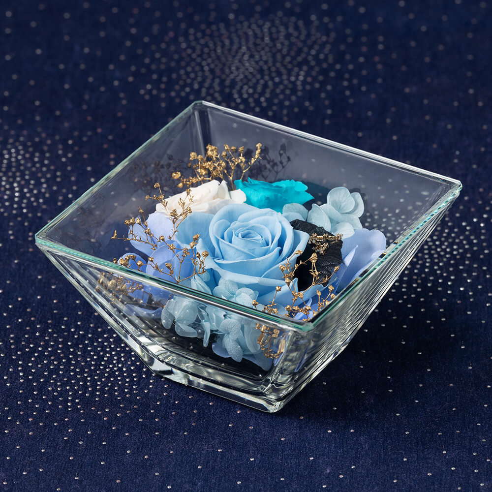 バラの隣で静かに瞬くのは、夜空を模した花弁にあしらわれた魚座のチャーム。手前に向かって広がるガラスに入ったデザインは、置いたときにお花と目が合いやすく、まるで小さな窓から星空をのぞき込んでいるかのようです。蓋付きなので、お手入れはホコリが付いたら表面をサッとふき取るだけ。きれいな瞬間を永く保てるので、上質なインテリアとして場所を選ばず飾っていただけます。