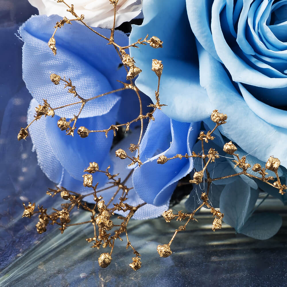 | 花材 | プリザーブドフラワー:バラ、ミニバラ、カスミソウ、アジサイ アートフラワー:ローズペタル(漆黒のバラの花弁)、アジサイ |