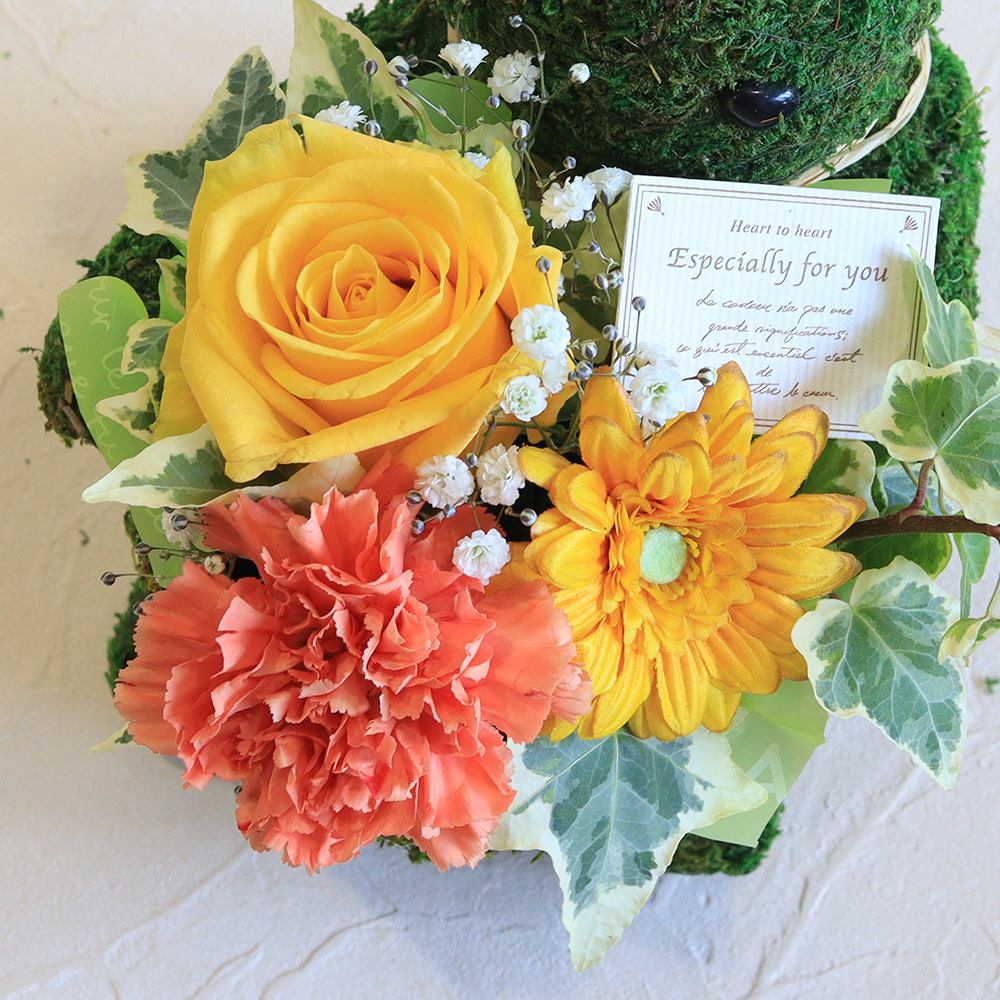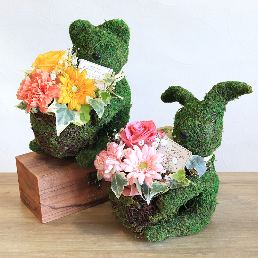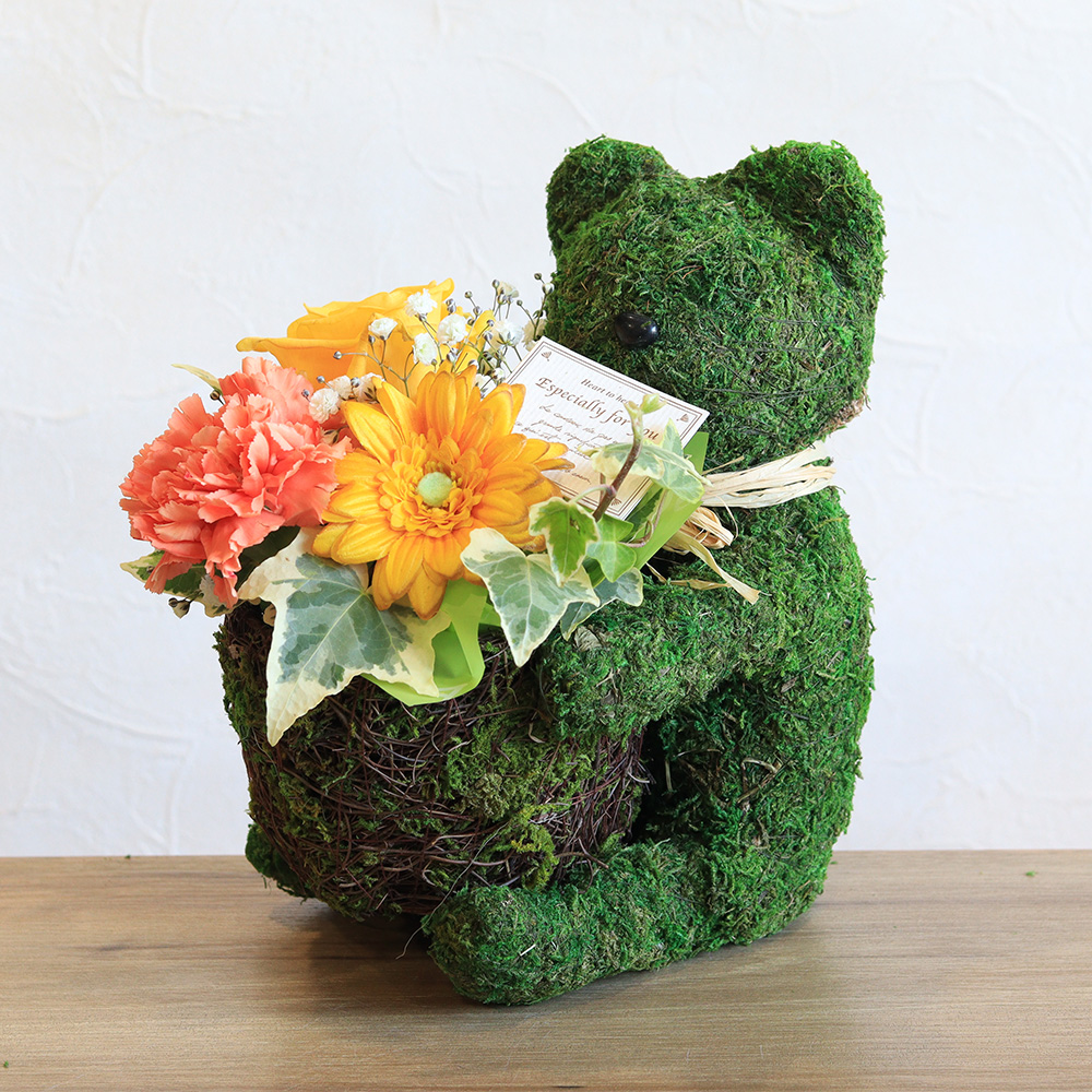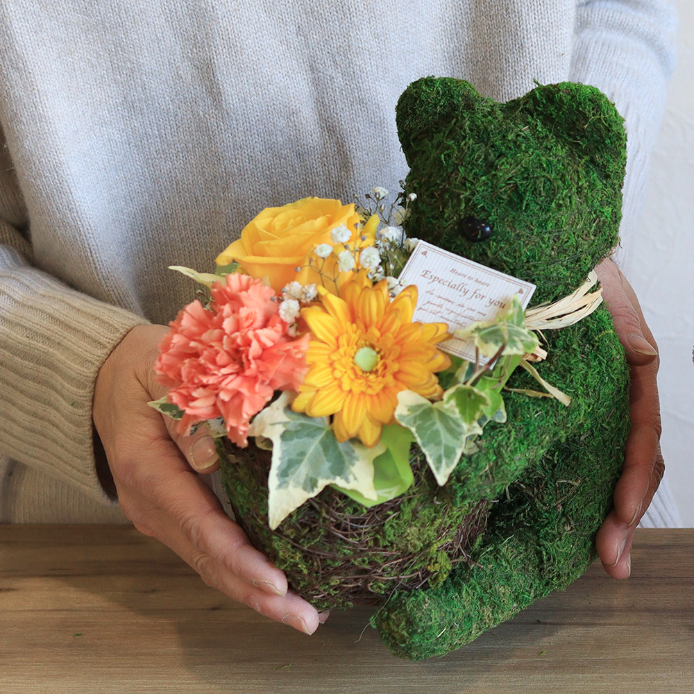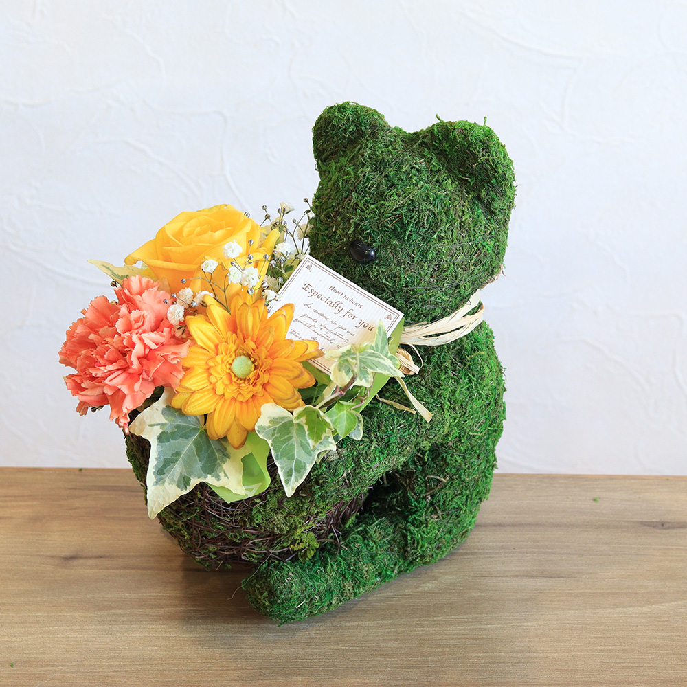 動物モチーフのお花ギフトは、可愛さとインパクト抜群です。 シルエットだけのシンプルなモスのくまポットは大人も楽しめ、どんなインテリアにも馴染みます。黄色のバラやガーベラ、オレンジのカーネションなど元気いっぱいなビタミンカラーの花々でまとめました。その場がパッと華やぎ、明るい雰囲気にしてくれそうですね。