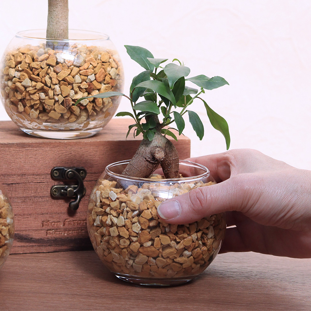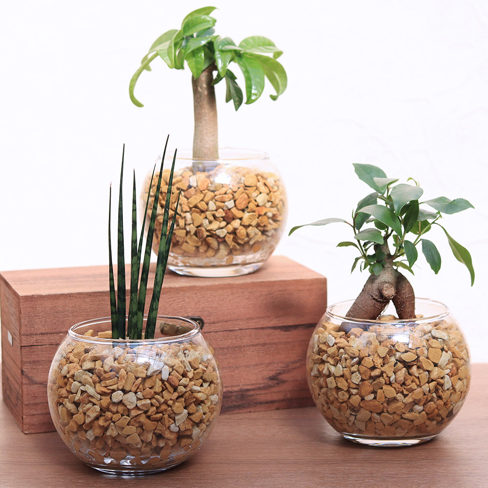 透明な器の中で、天然ゼオライトのナチュラルな質感がグリーンを引き立てる清潔感あふれる仕立てで、どんなインテリアにも自然に溶け込みます。
