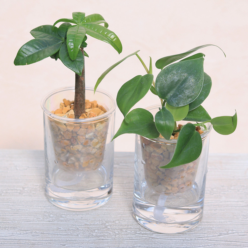 手のひらにのるようなミニサイズのパキラと、ハート型の葉が愛らしいオキシカラジウムを2個セットでお届けします。