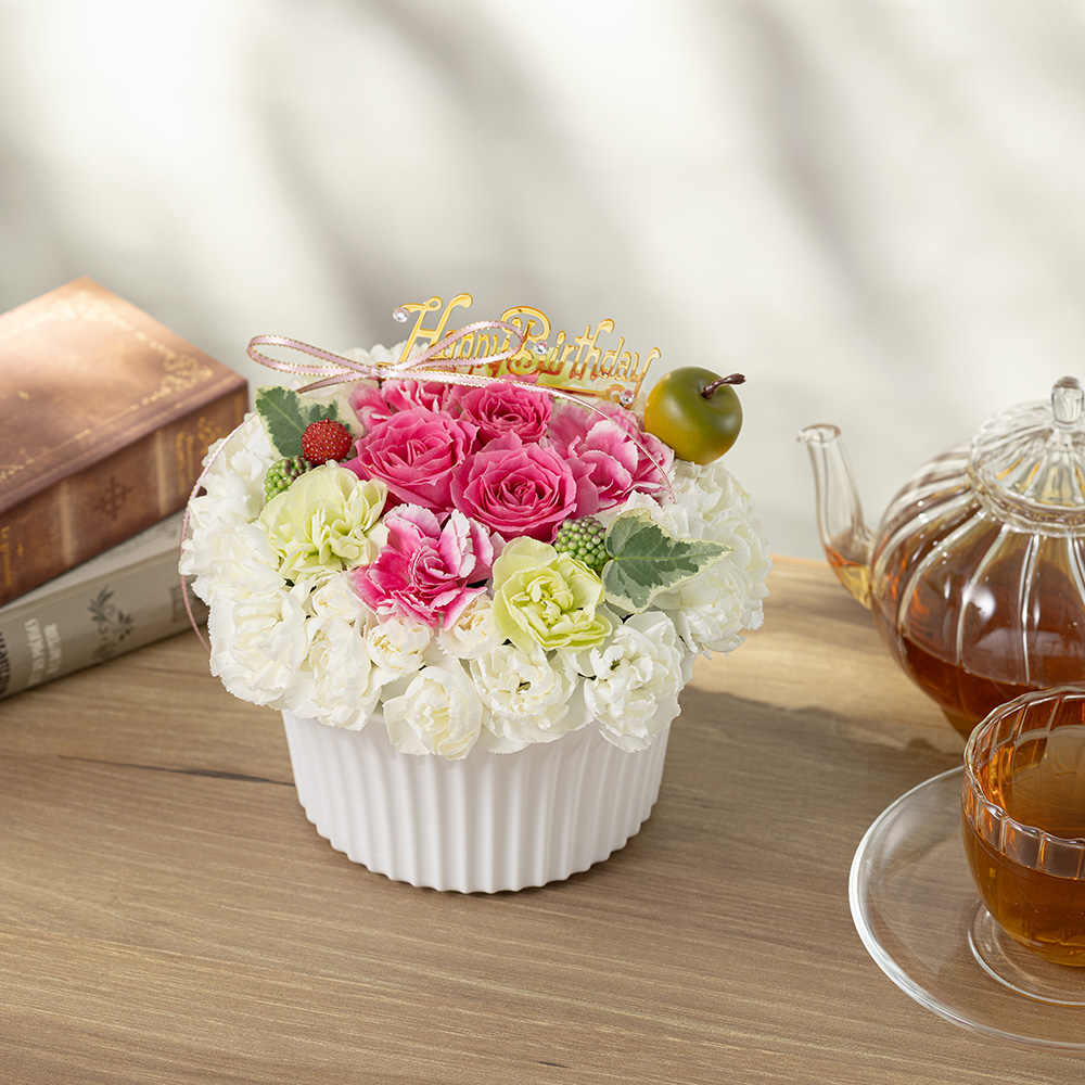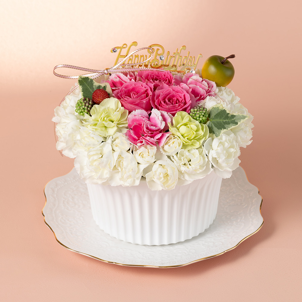 白いスプレーカーネーションをホイップクリームに見立てた、まるで本物のケーキようなフラワーアレンジメントです。4月の誕生石「ダイヤモンド」をイメージした花々をあしらい、華やかに仕上げました。