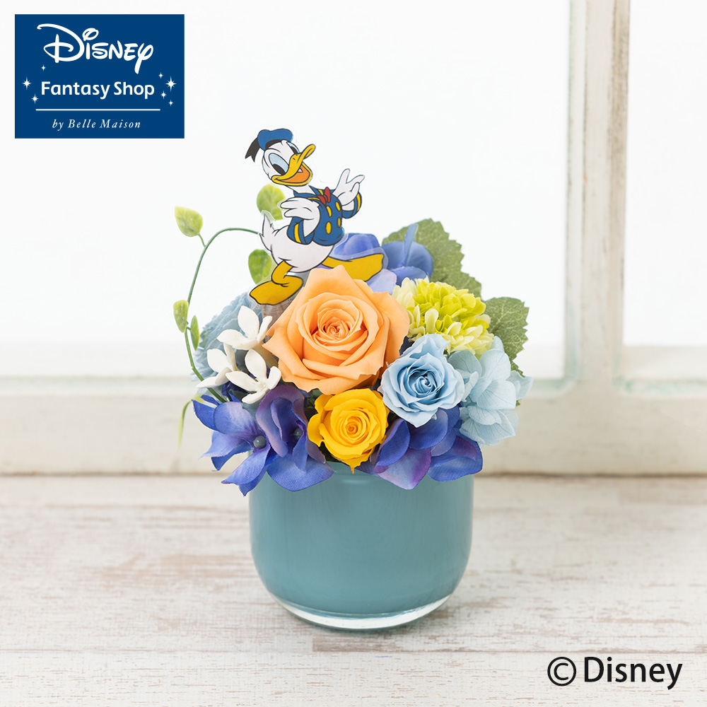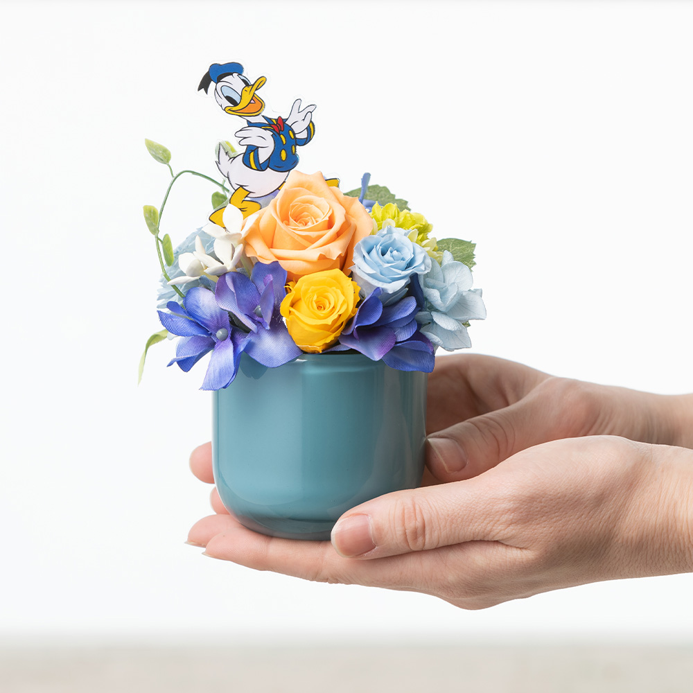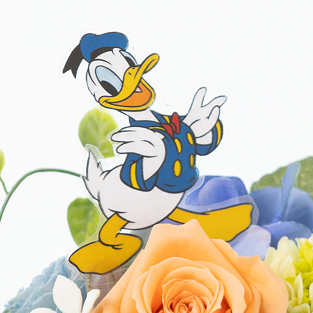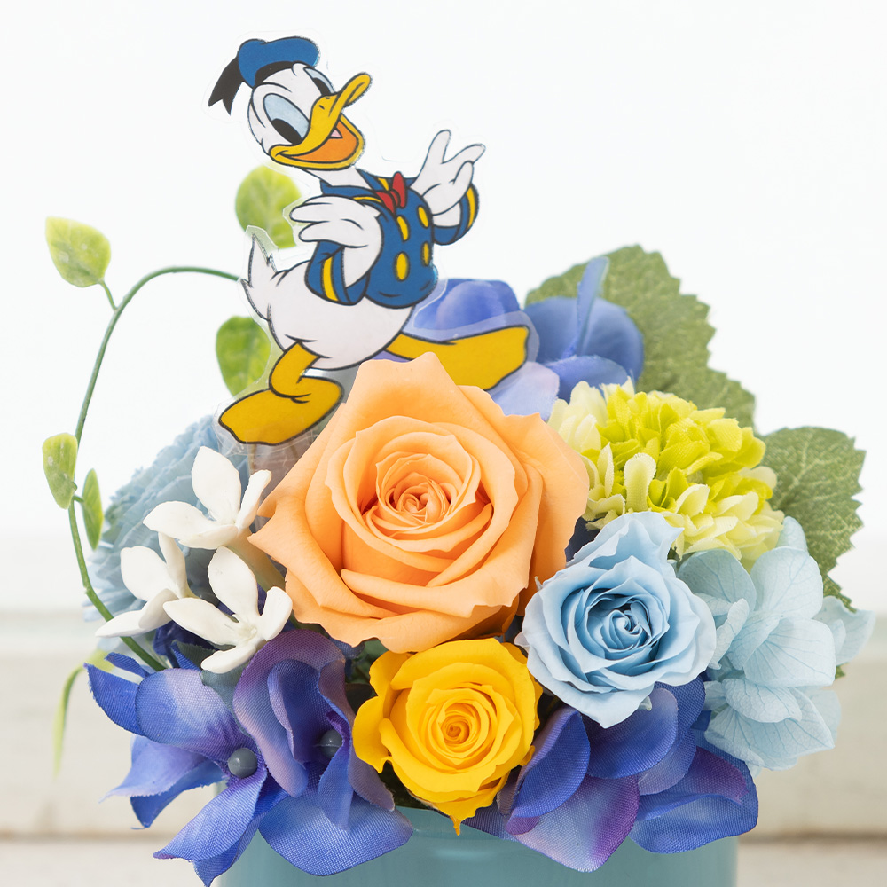 世界中の幅広い年齢層から愛されるディズニーキャラクター「ドナルドダック」。そんなドナルドダックデザインのプレートが入ったお祝いムードいっぱいのアレンジメントはいかがですか?プリザーブドフラワーは、「ドナルドダック」を象徴するブルーをベースに、シャーベットオレンジのバラや黄色のミニバラを合わせしました。