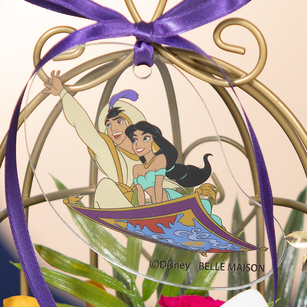 魔法のじゅうたんに乗って、これまでに見たことがない新しい世界へ旅をするアラジンとジャスミンを表現しました。魔法のじゅうたんに乗った寄り添うふたりがデザインされたアクリルプレートを空を飛んでいるかのように吊り下げています。
