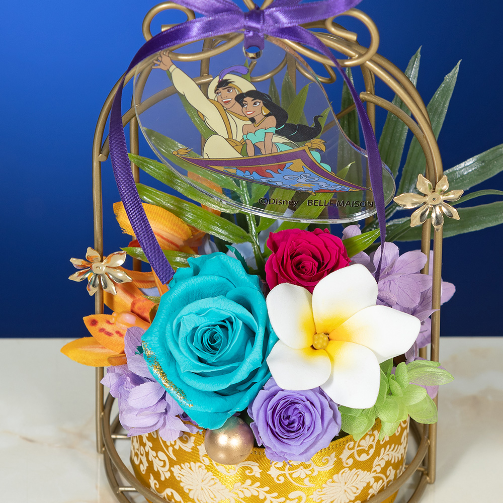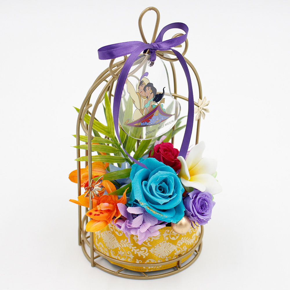 | 資材 | アクリルプレート(アラジン&ジャスミン)、メタルフラワー、パールピック(ゴールド)、リボン、鳥かご風アイアンバスケット、お手入れ説明付き |