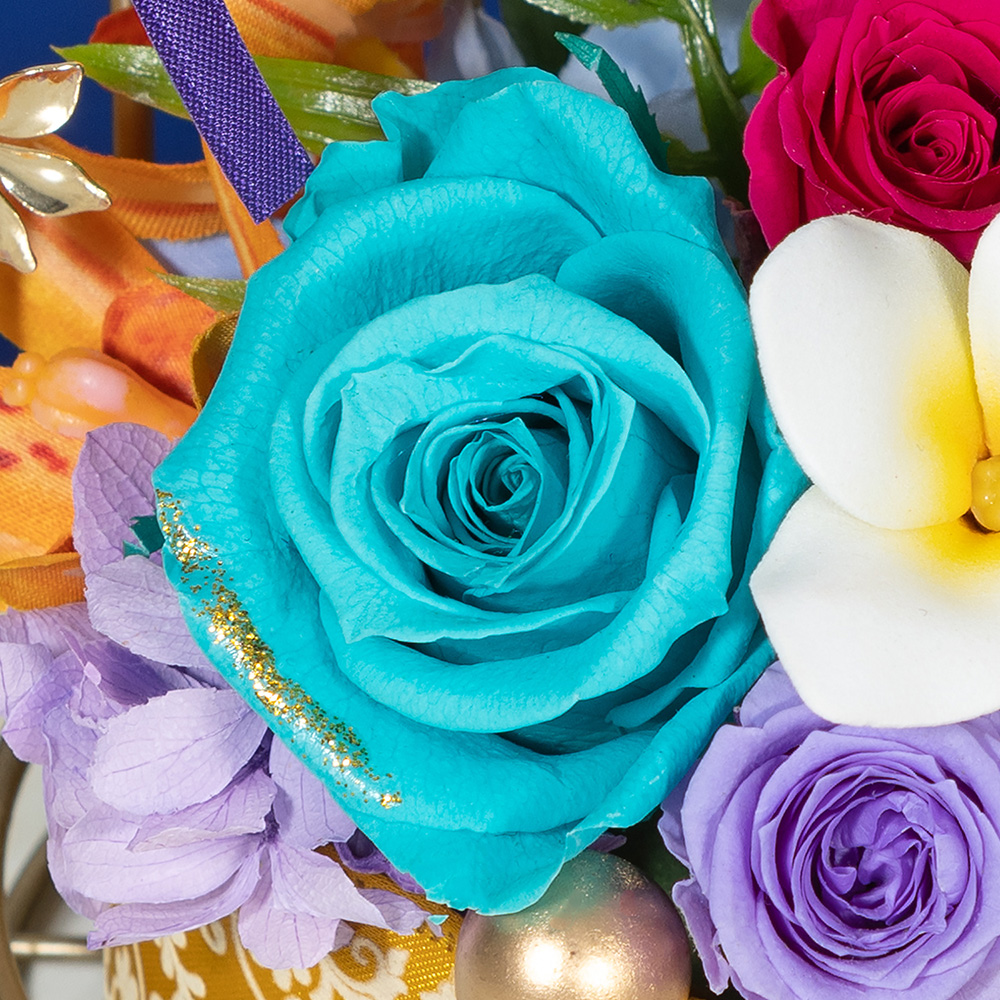 足元には、「アラジン」の世界観をイメージしたカラフルな花々をアレンジしました。鮮やかなターコイズブルーのバラにはゴールドのラメを施し、光が当たるとキラキラと輝きます。