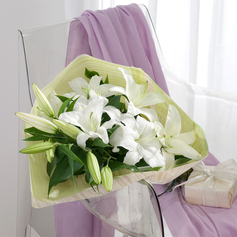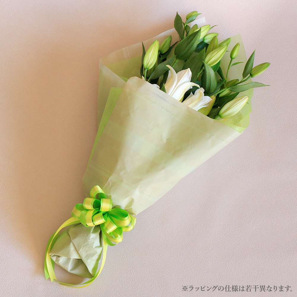ユリ独特の芳しい香りと、清々しい白とグリーンの配色が奏でる極上のアロマ。思わず引き寄せられるとっておきの花束です。