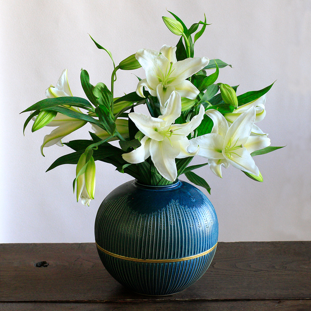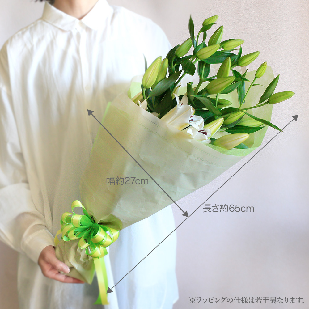 | 花材 | オリエンタル百合(ホワイト)×3本 ※12輪以上。長くご鑑賞いただくために、つぼみの多い状態でお届けします。 |