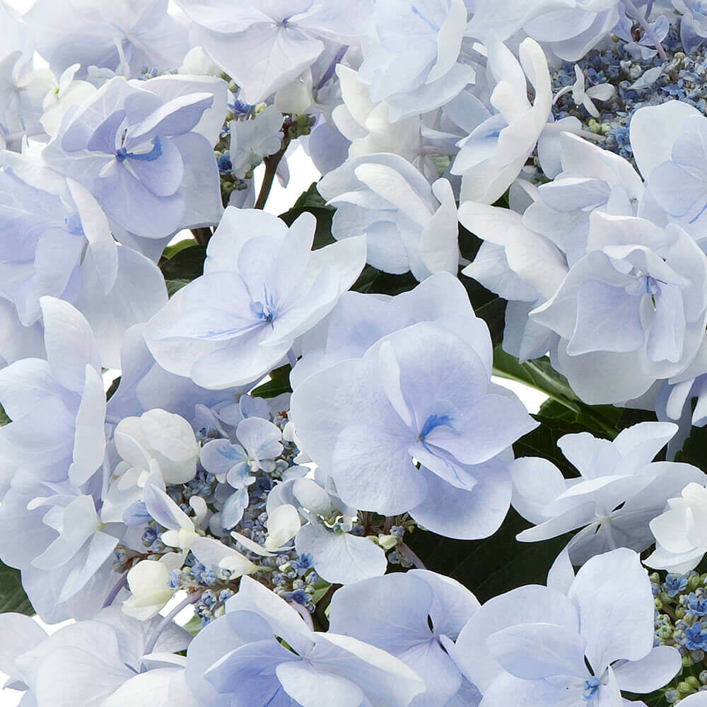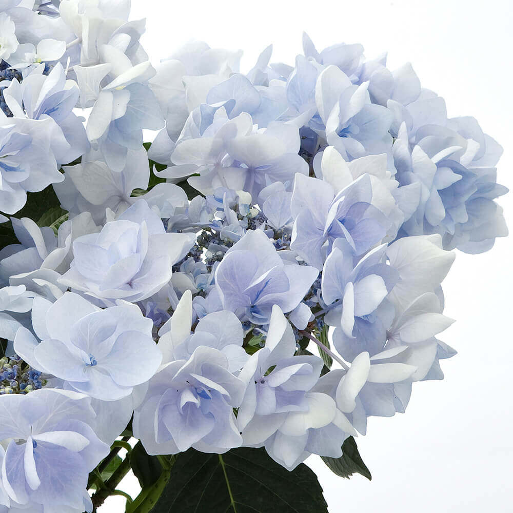 「ノーブルブルー」という名にふさわしい、透き通るような清らかな青色が魅力のアジサイです。幾重にも重なる八重咲きの花々は、まるで花束のような優雅さ。