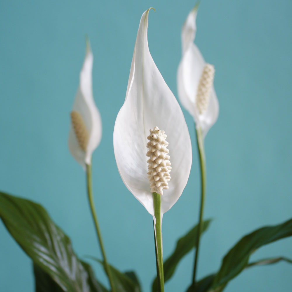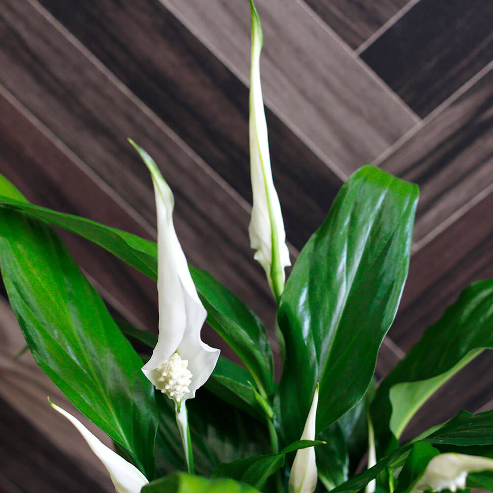 鮮やかな深い緑の葉に、光を宿したような純白の「苞(ほう)」が凛と立ち上がるスパティフィラム。