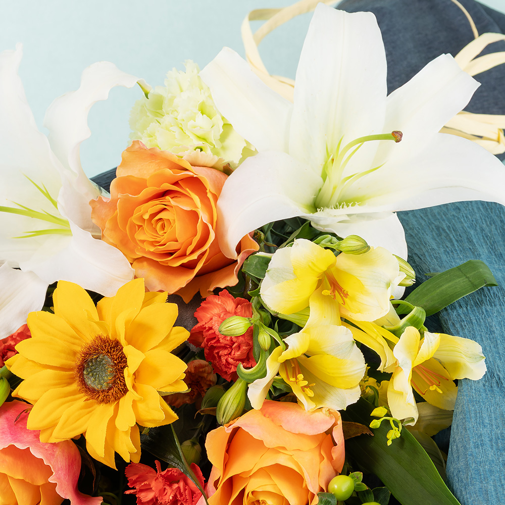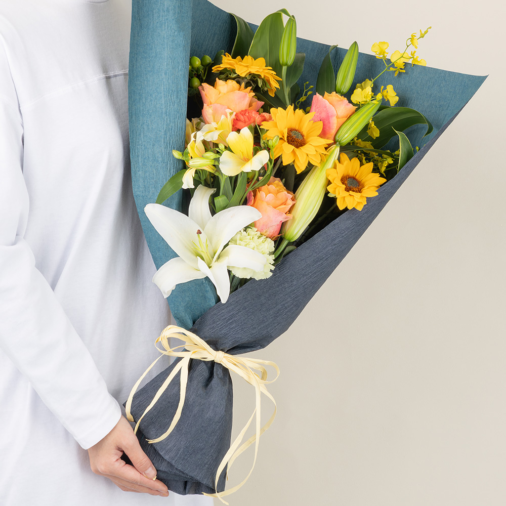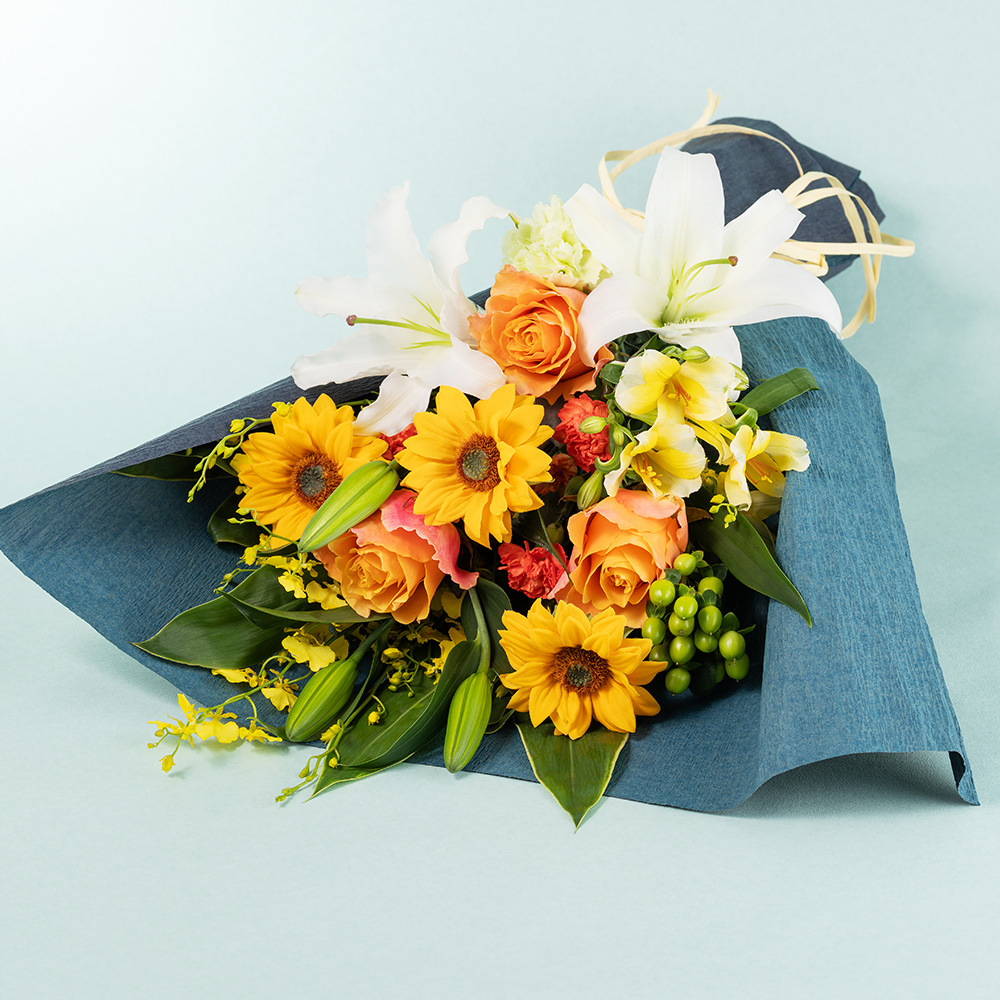 華やかに咲き誇る純白の百合やオレンジ色のバラに蝶々のようなオンシジウム、父の日のギフトとして人気が高いヒマワリを合わせてゴージャスな花束に仕立てました。百合には「子の愛」「威厳」の花言葉があり、ヒマワリには「光輝」「憧れ」の花言葉があります。憧れのお父さんへ感謝と尊敬の想いをストレートに伝えてくれそうです。