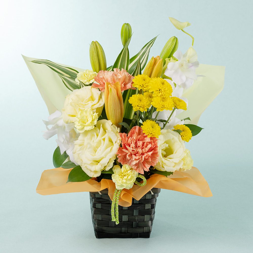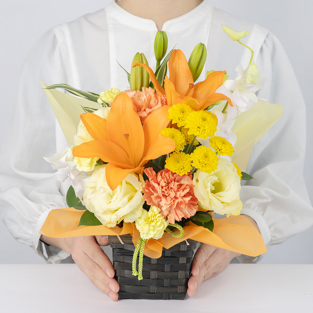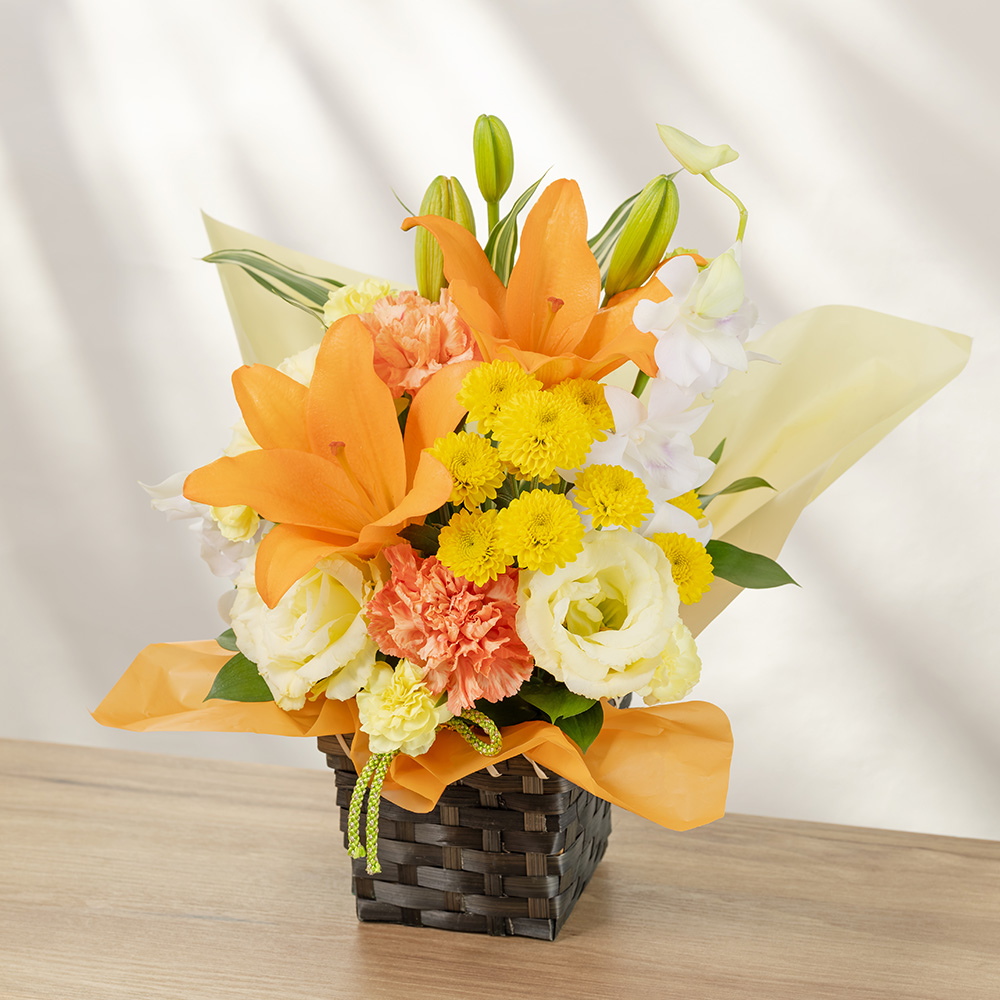 華やかなオレンジ色のスカシ百合や、フリルのような花びらが重なる上品なトルコキキョウ、見ているだけでお父さんも落ち着く、あたたかな花々を集めたアレンジメントです。和風の黒い籠に清涼感溢れるサンデリアーナ(葉物)や優雅なデンファレで小粋なスタイルに仕上げました。