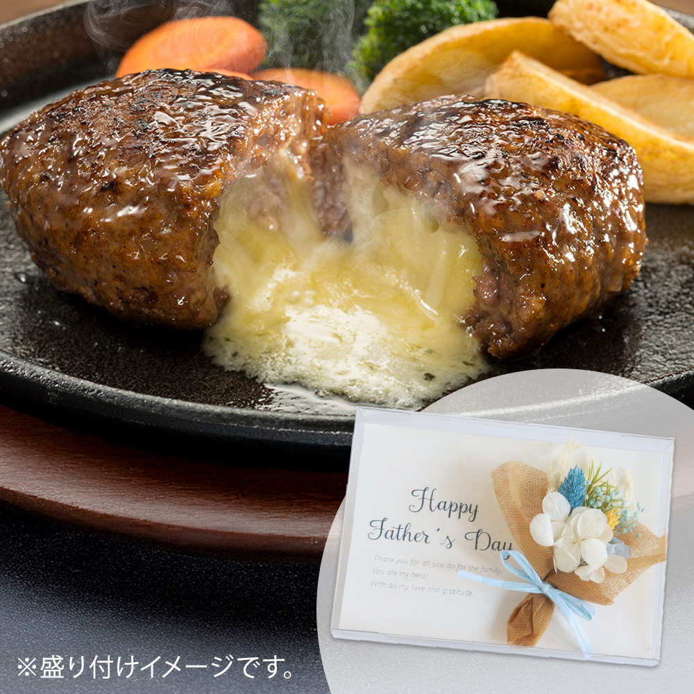 「お父さんに驚きを贈りたい」そんな想いを叶える、肉の旨みが力強く広がるこだわりのハンバーグです。ナイフを入れた瞬間に溢れ出すとろ〜りチーズと、お肉が持つ濃厚な旨味が特徴です。