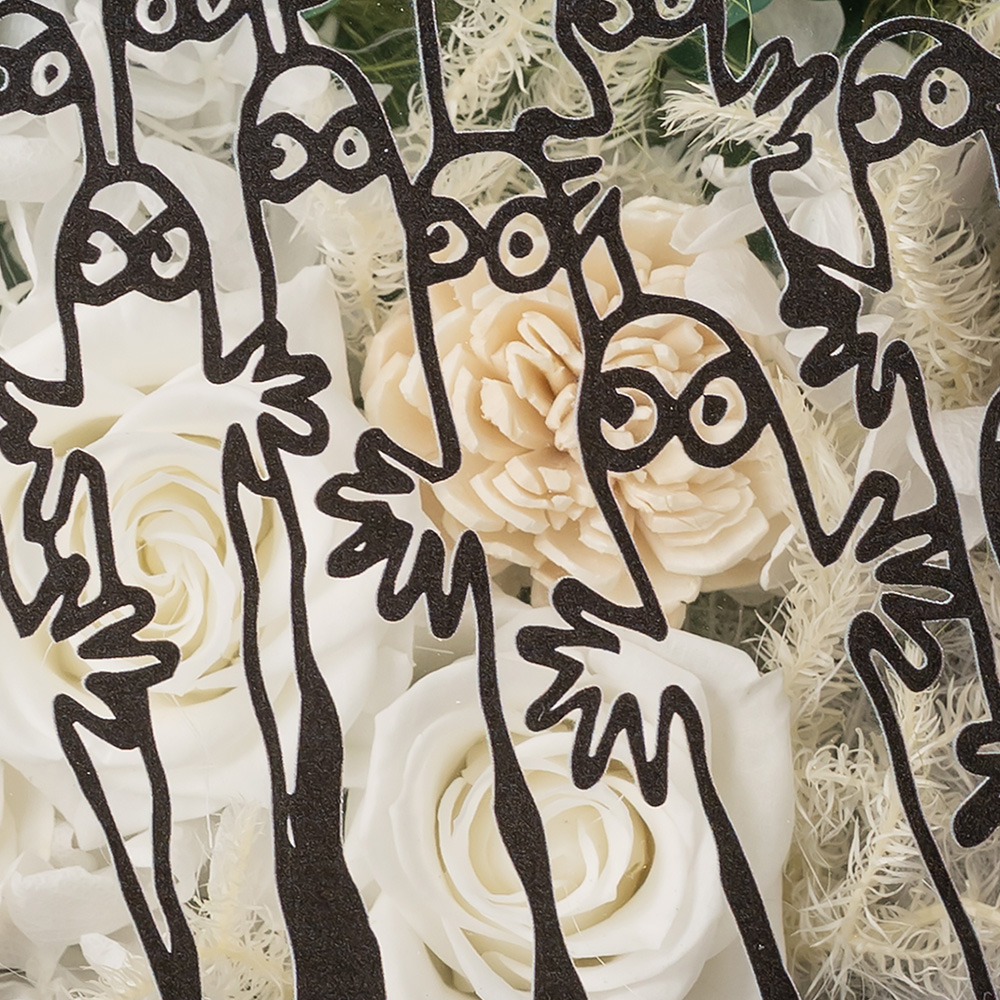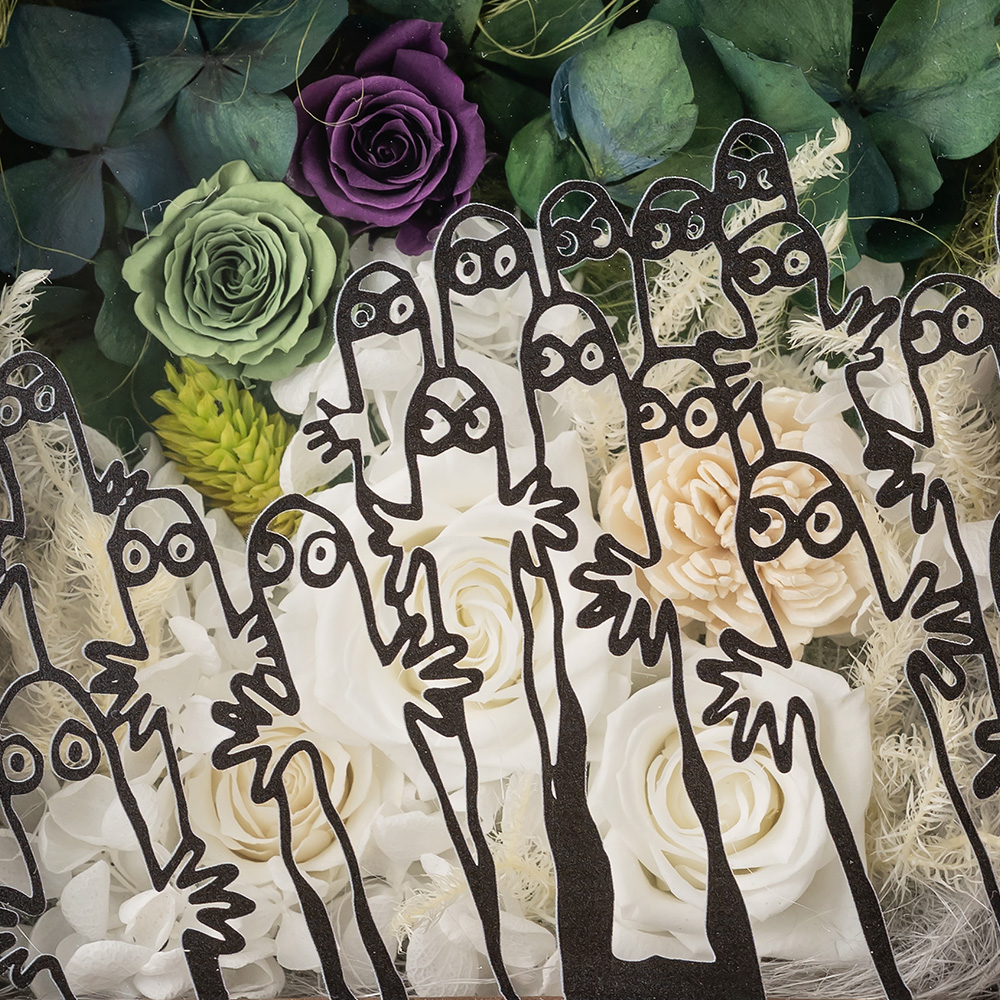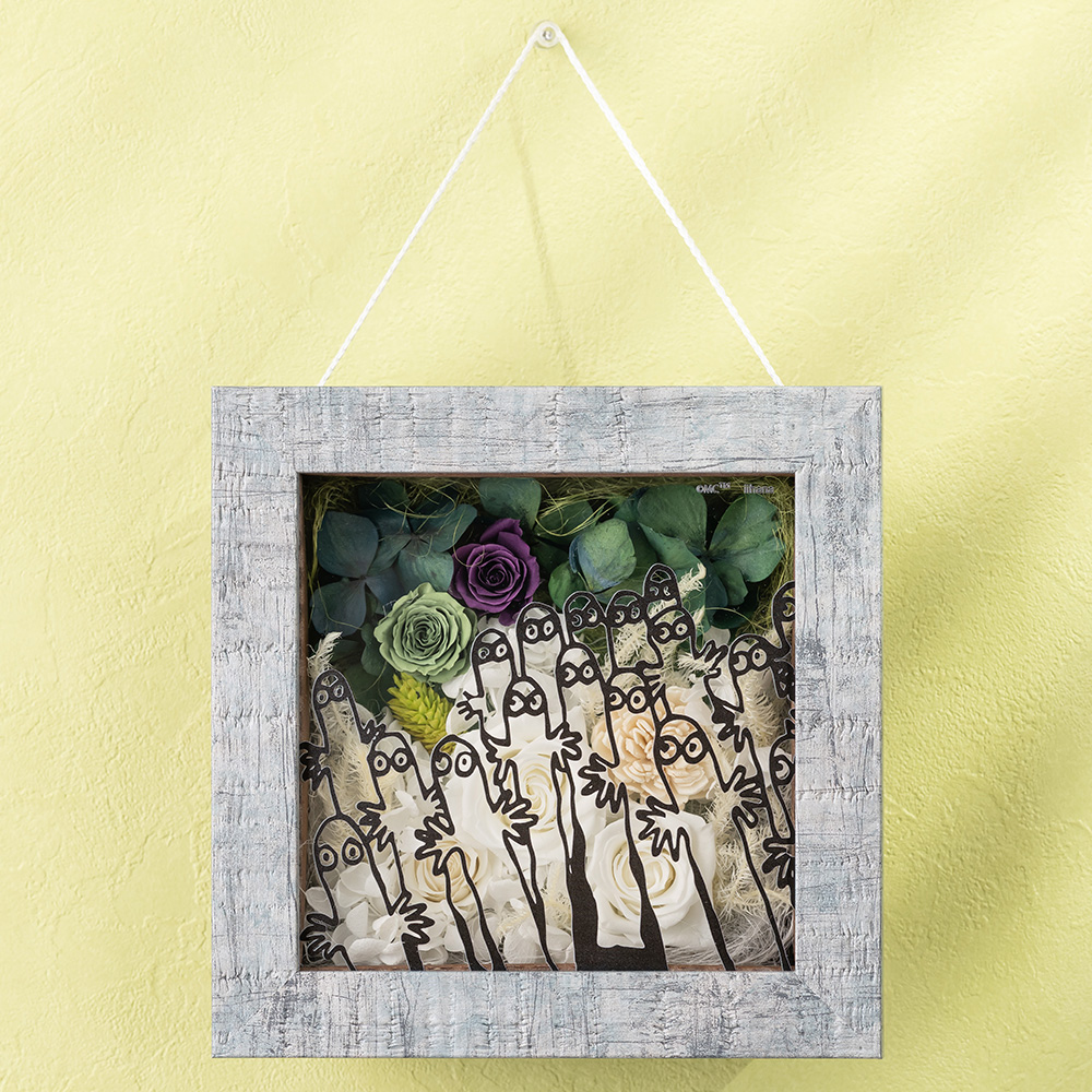 ムーミン谷の不思議な住人、ニョロニョロたちが静かにたたずむ幻想的なシーンを表現したボタニカルアートフレームです。シックなパープルとグリーンのプリザーブドフラワーのバラを配し、ニョロニョロたちの神秘的で少し不気味な魅力を上品に演出しています。アンティーク調のホワイトウォッシュフレームが、まるで古い森の奥深くで発見された秘密の光景のような雰囲気を醸し出します。