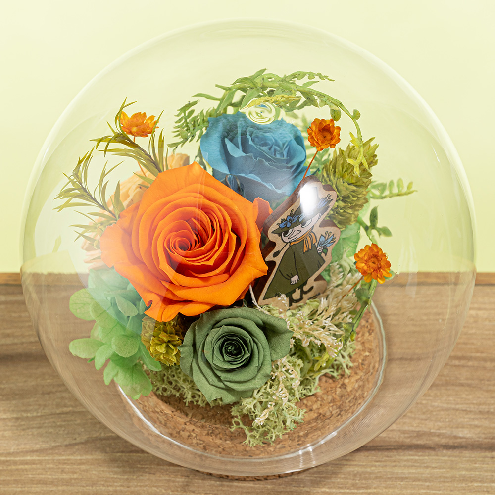 スナフキンが美しい花々に囲まれてたたずむ、幻想的なガラスドーム型プリザーブドフラワーアレンジメントです。透明なガラスドームの中に、アートプレートのスナフキンのスカーフと帽子の飾りの花に合わせて、オレンジとブルー、グリーンのバラを組み合わせて、バラの色でスナフキンをイメージしました。自然を愛するスナフキンにぴったりの、様々なグリーンの葉物や小花が豊かに茂り、まるでスナフキンがいつも過ごしている森の中のような自然な美しさを演出しています。