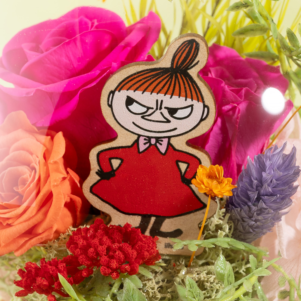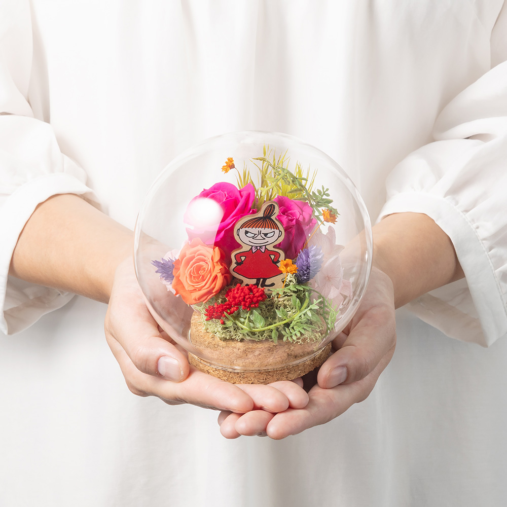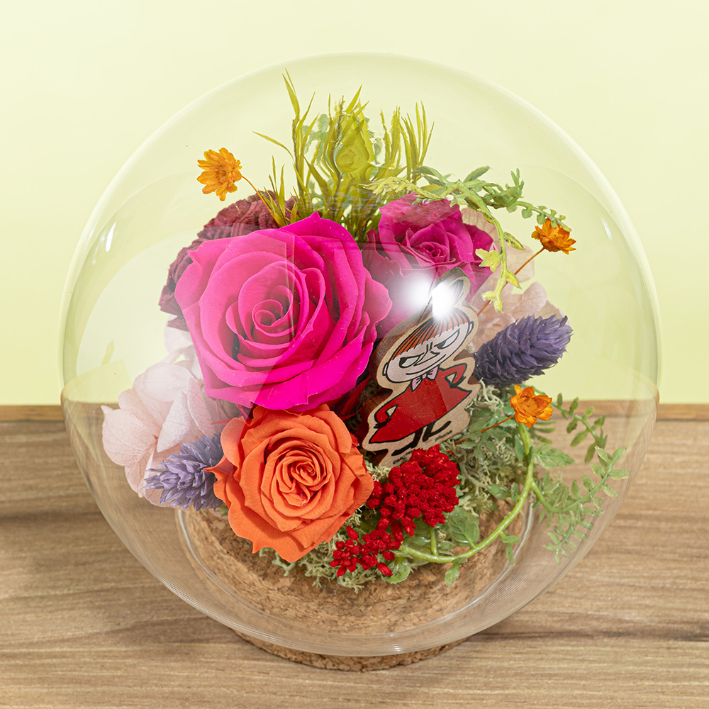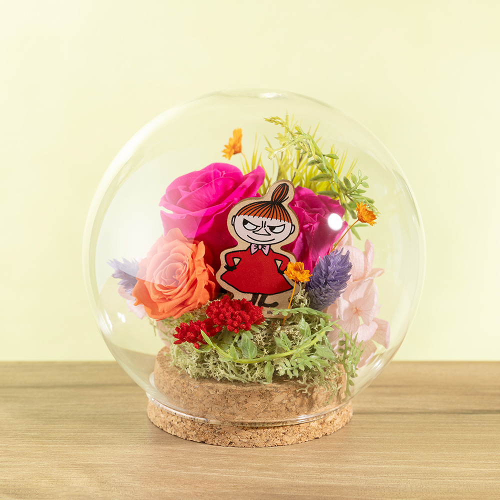 リトルミイが、色とりどりの花々に囲まれて楽しそうに過ごしている様子を表現した、ガラスドーム型プリザーブドフラワーアレンジメントです。透明なガラスドームの中に、リトルミイの赤いワンピースにぴったりの鮮やかなピンクのプリザーブドローズを中心に、オレンジ、紫、グリーンの花々が賑やかに配置されています。まるで彼女がお花畑で遊んでいるかのような、カラフルで楽しい世界が広がります。