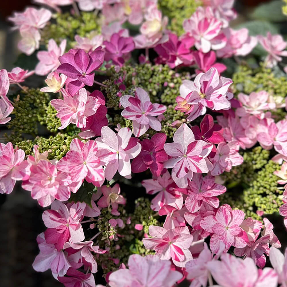 まるで職人が織り上げた上質な織物のように、花びら1枚1枚に繊細な絞り模様が入るアジサイ「衣純千織」は、一輪ごとにピンクの濃淡が異なり、眺めるたびに新しい発見があります。