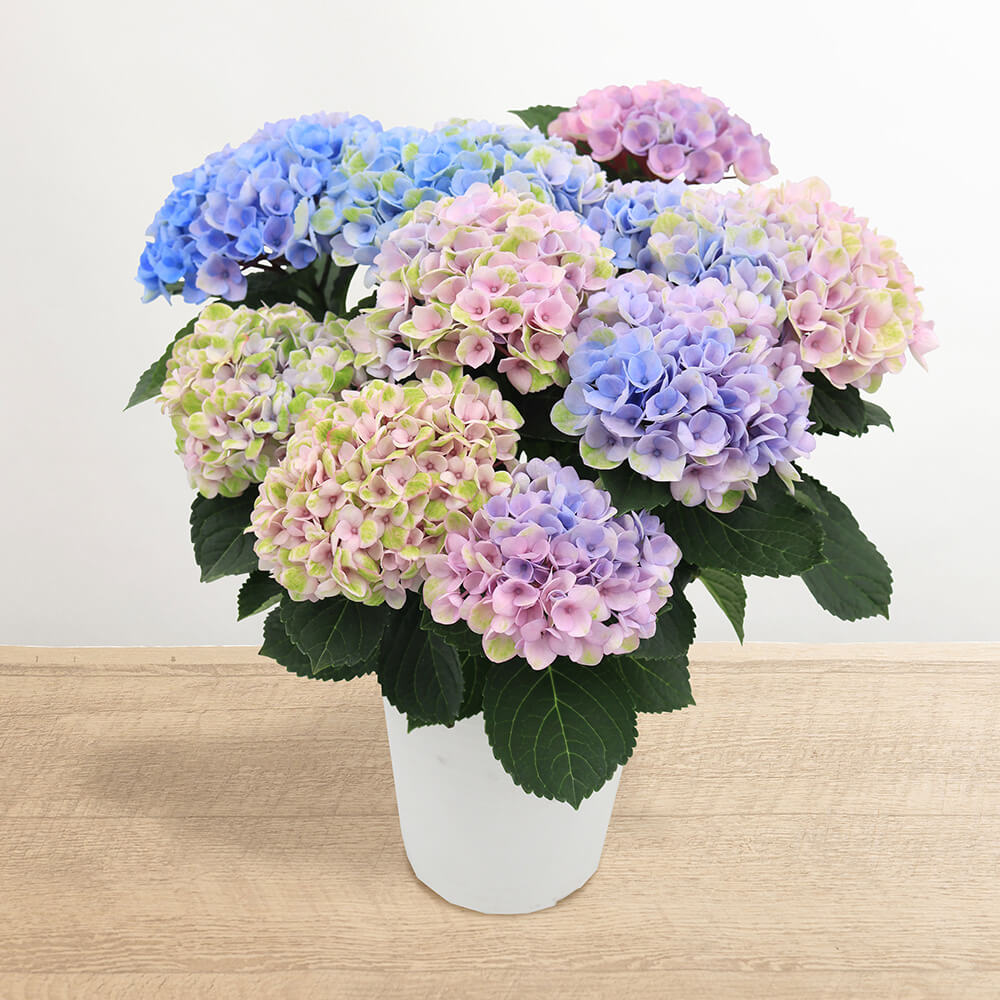 ひとつの花の中で淡いブルーからピンクまで入り混ざったグラデーションカラーになり、その名の通りレインボーのような美しさ。一鉢一鉢発色の具合も変わるので、それぞれ独自の幻想的な色合いを個性としてお楽しみください。