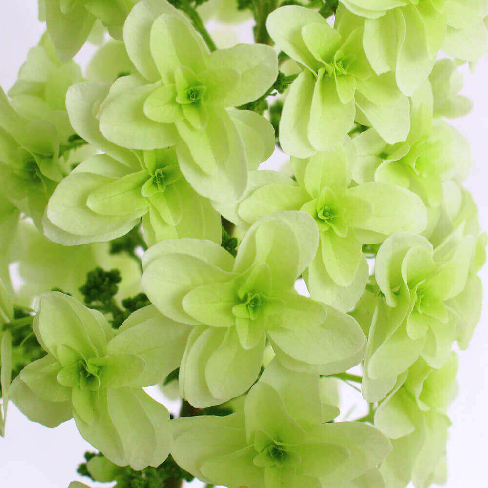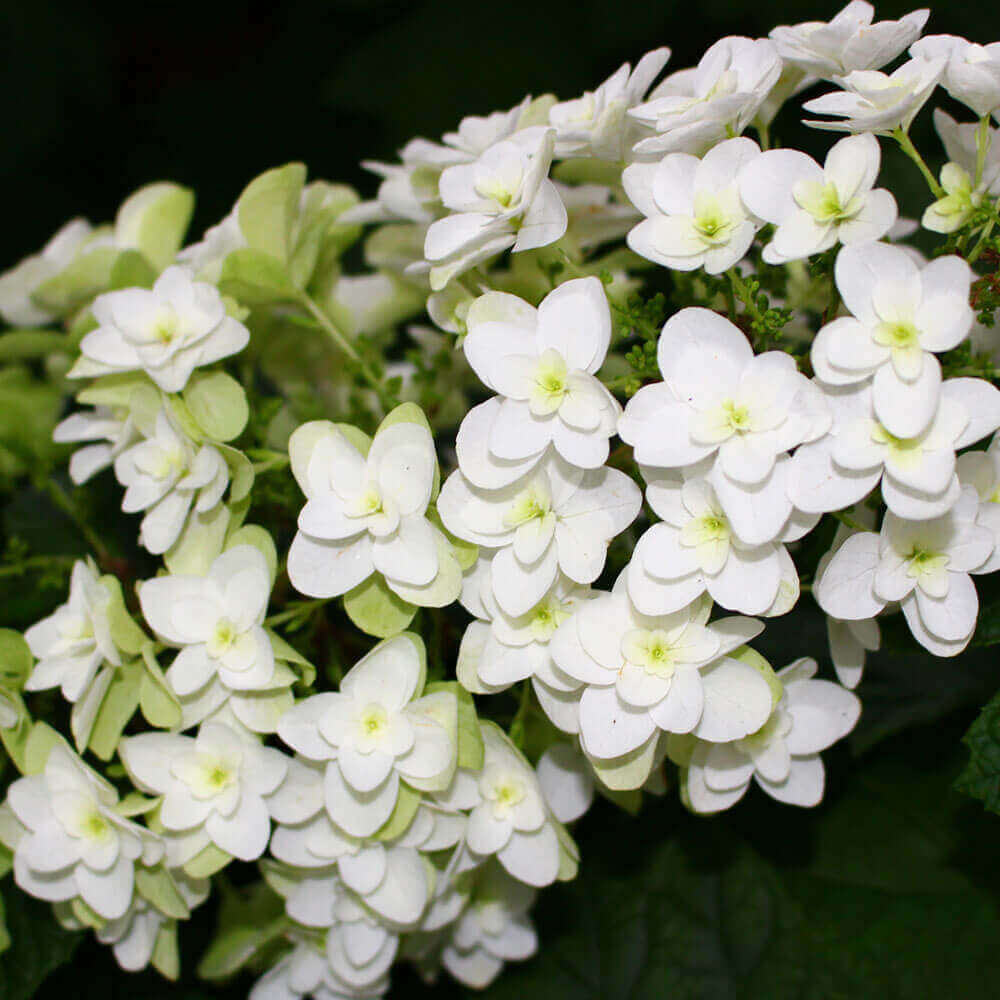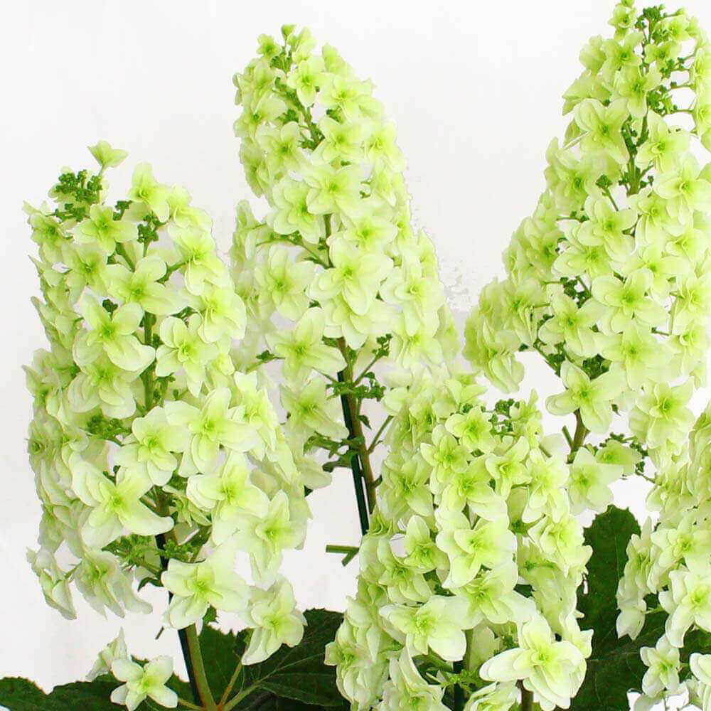 柏餅でおなじみの柏の葉に似ていることから名前が付いた「かしわ葉アジサイ」。名前だけでなく、その花もとてもユニークで個性的です。清潔感のあるグリーンの八重咲きの装飾花がたくさん集まり、20cm前後の大振りなピラミッド状の花穂をつけます。咲き進むにつれ、夏にはアンティークな趣の深緑へと変化し、外側の装飾花がピンク色に染まっていきます。晩秋には葉が真っ赤に紅葉する様も美しく、一年中長く楽しめます。イングリッシュガーデンの暗い部分を彩るのに使われることも多く、明るいグリーンの花色でお庭を明るくしてくれます。