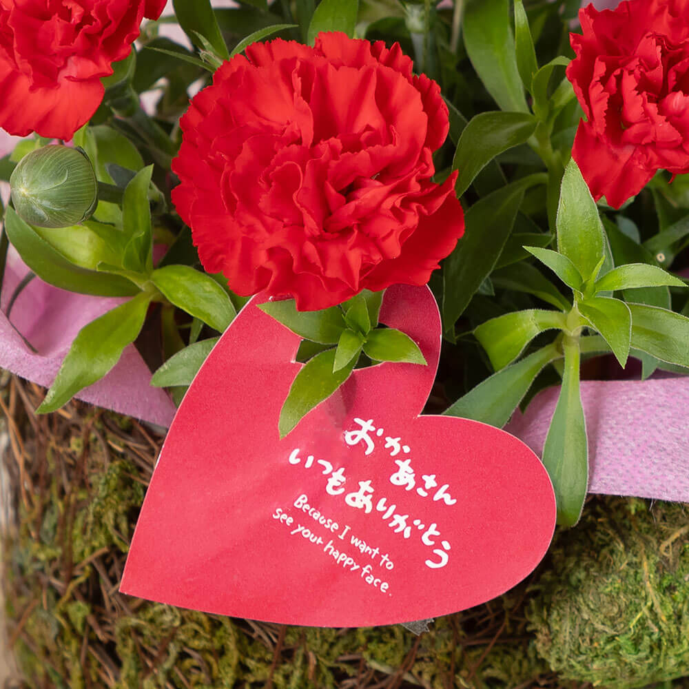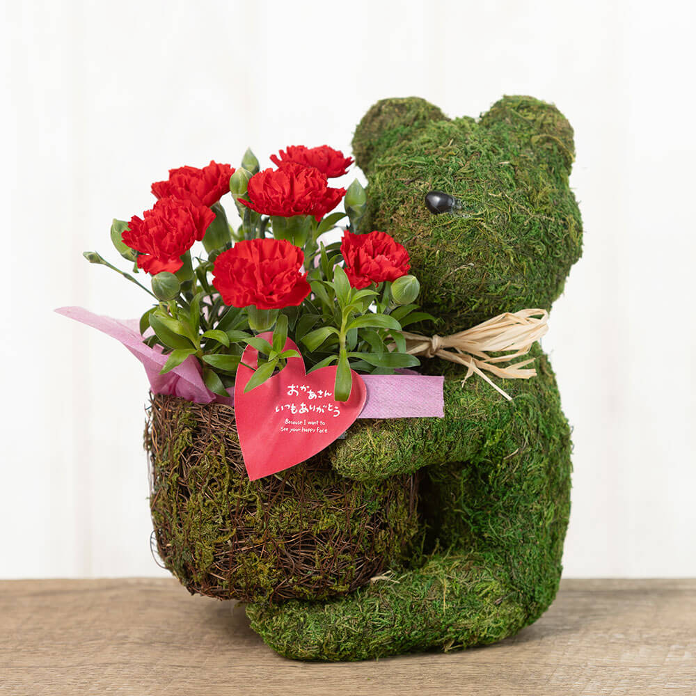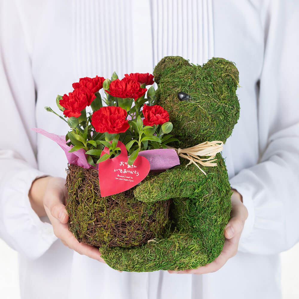 モスベアが両手にお花を抱えてお届けします。ベアが抱えた花は、母の日には欠かせない真っ赤なカーネーション。鮮やかに咲き誇るその姿には、『母への愛』という花言葉が込められています。