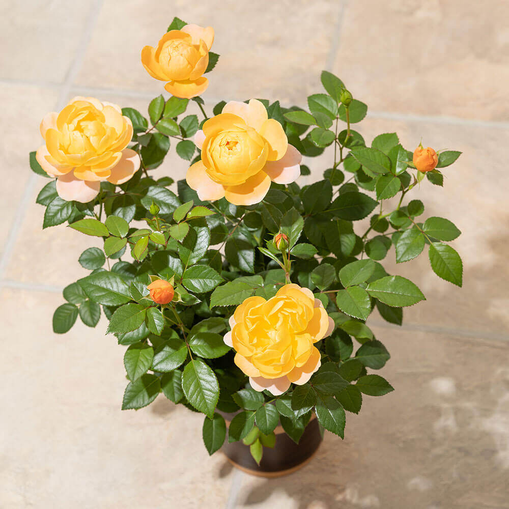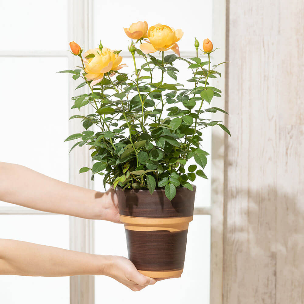 ほんのりとピンクを帯びたオレンジ色から淡いピンク色への花色の変化と、ティーの香りを楽しむことができます。ふんわりと花びらを広げたカップ咲きの花は存在感も抜群です。コロンとした愛嬌たっぷりのつぼみも魅力的です。1輪1輪に個性があるので、お気に入りの1輪を見つけてください。表情豊かなバラはお庭を楽しく、明るく演出してくれることでしょう。鉢植えなので毎年可愛らしい花をお楽しみいただけます。